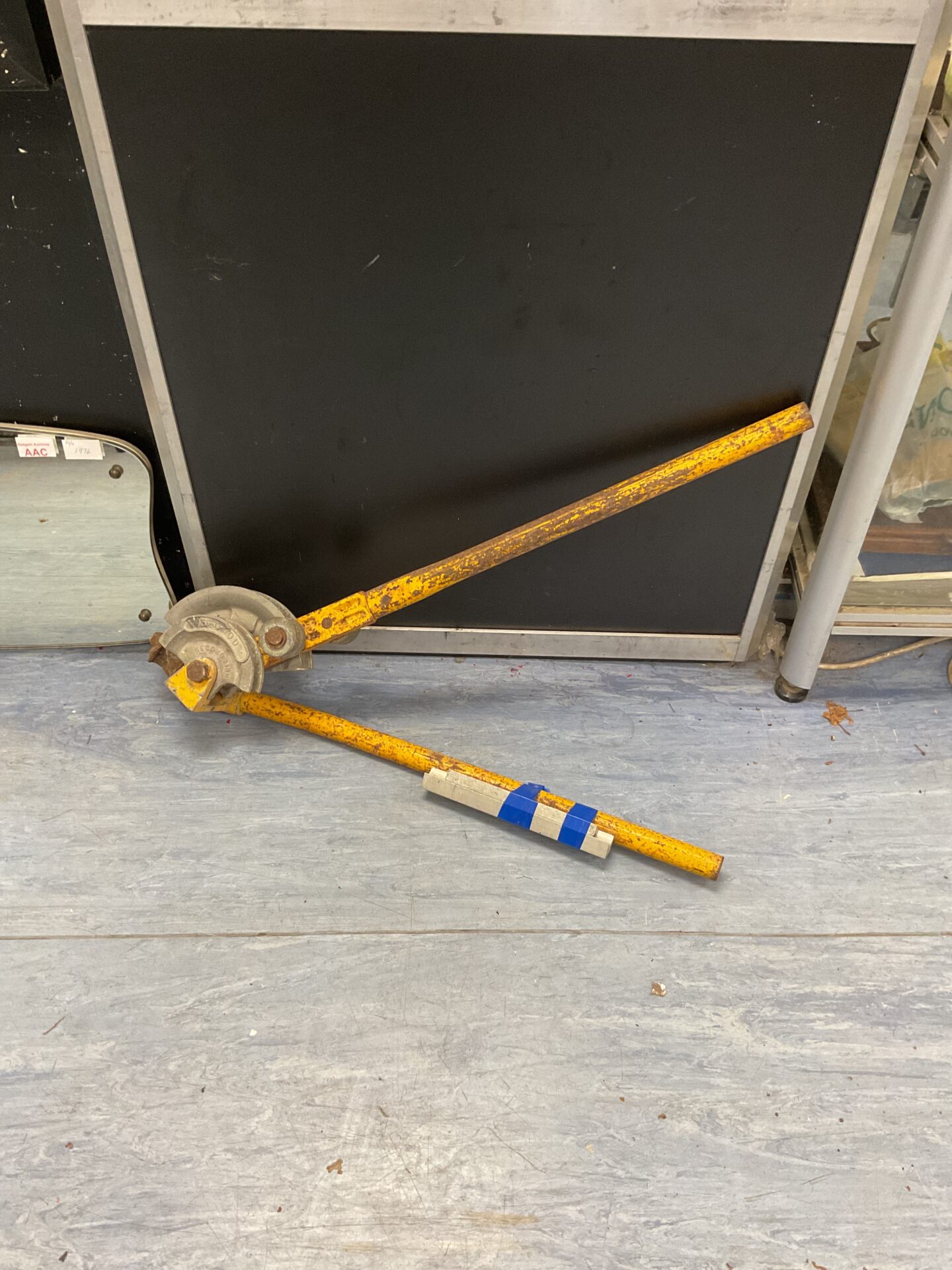 This is a robust pipe bender, designed for shaping metal tubing and pipes. The tool features a sturdy construction with a yellow-painted metal frame and a silver-coloured bending head. It’s a manual tool, relying on leverage to achieve the desired bends, making it ideal for various plumbing and metalworking tasks.