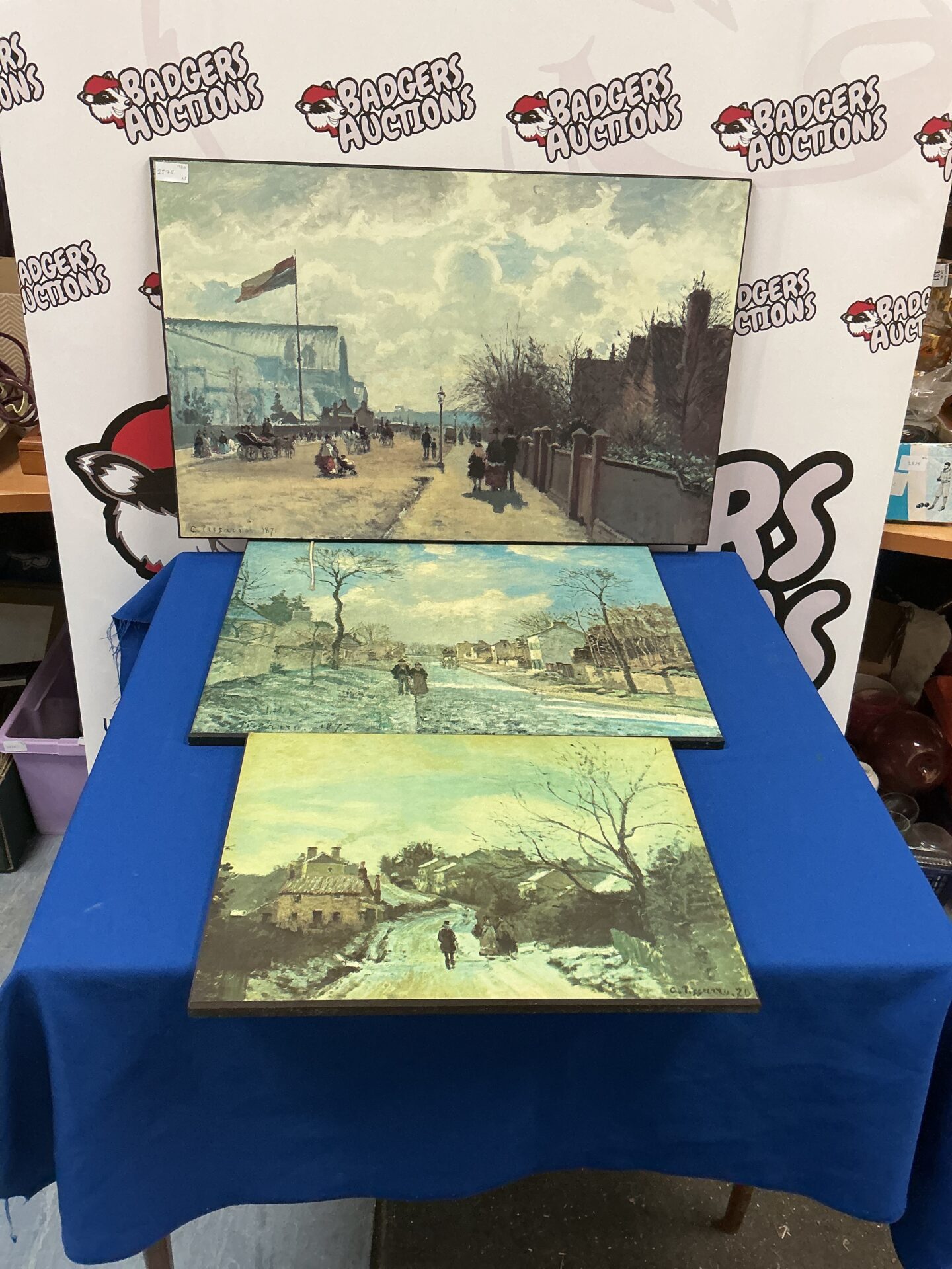 This lot comprises three prints on board, notably including a reproduction of Camille Pissarro’s depiction of The Crystal Palace. Pissarro, a key figure in the Impressionist movement, captured the grandeur of this iconic Victorian structure in his work. The print showcases Pissarro’s signature style, with loose brushstrokes and a focus on capturing the atmosphere and light of the scene. The other two prints depict landscape scenes.