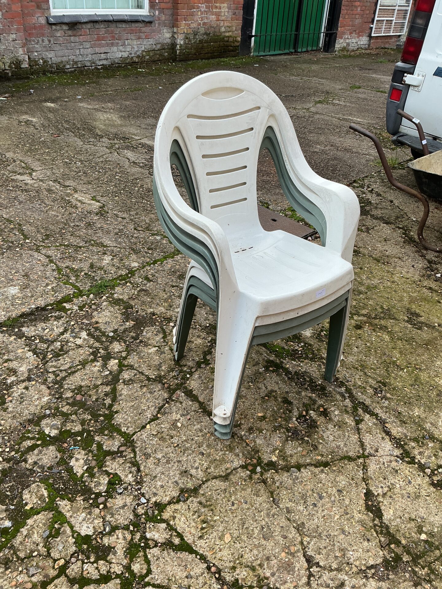 This lot comprises four plastic garden chairs, designed for outdoor use. These chairs feature a simple, functional design, ideal for patios, gardens, or balconies. The construction is entirely plastic, making them lightweight and easy to move and store. They are designed to stack, which is ideal for storage.