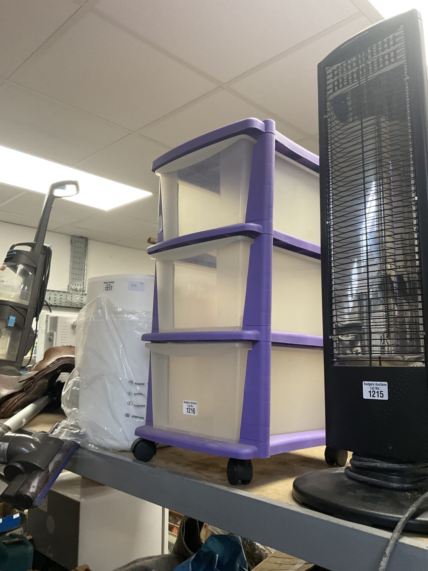 This is a plastic three-drawer wheeled cabinet, designed for versatile storage solutions. The cabinet features a bright purple finish and is mounted on castors for easy mobility. Its construction suggests it’s intended for use in a home, office, or workshop setting, offering convenient access to stored items.