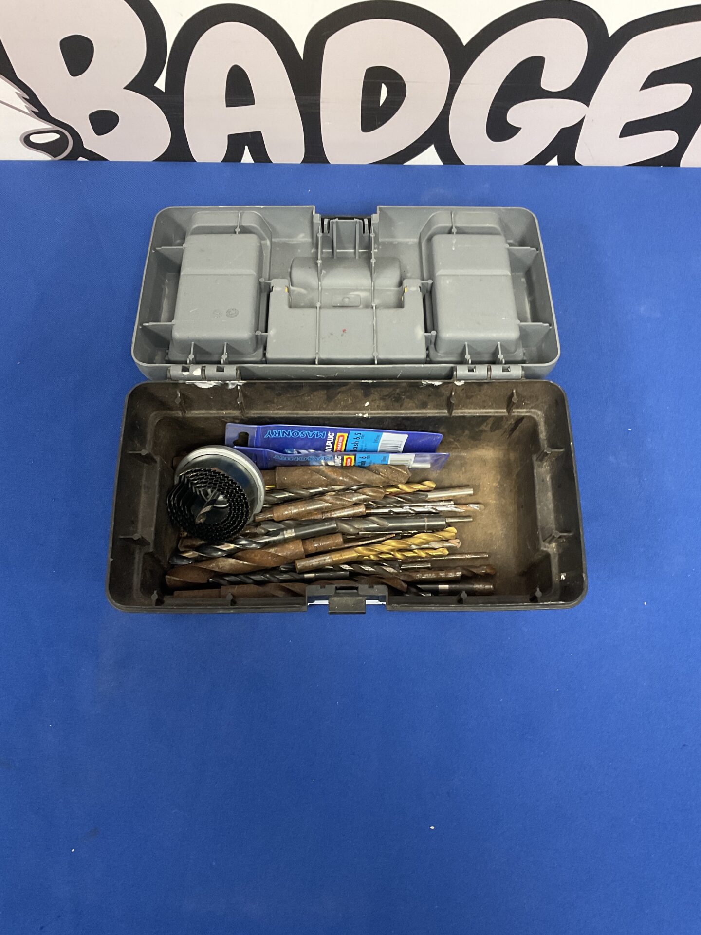 This is a small, plastic toolbox containing a selection of drill bits. The toolbox is designed for portability and convenient storage of essential tools. Its compact size makes it ideal for home use, DIY projects, or keeping in a vehicle for quick repairs. The plastic construction offers durability and resistance to common wear and tear.