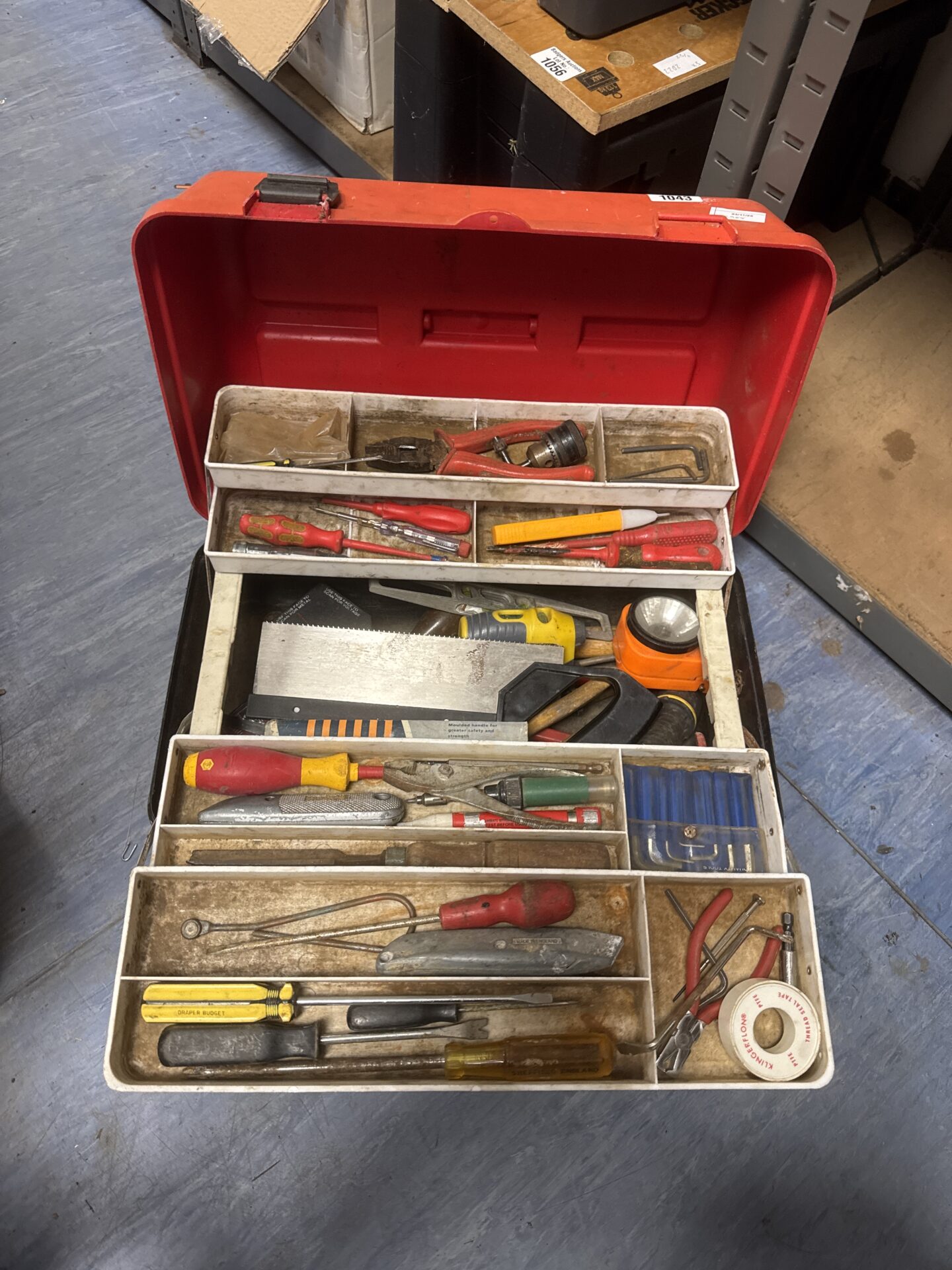 This plastic toolbox contains a variety of hand tools, appearing to be a general-purpose set for home repairs and DIY projects. The toolbox itself is red and features a carrying handle, and internal trays for organization. The tools visible include screwdrivers, pliers, a saw, and other implements commonly found in a handyman’s kit.