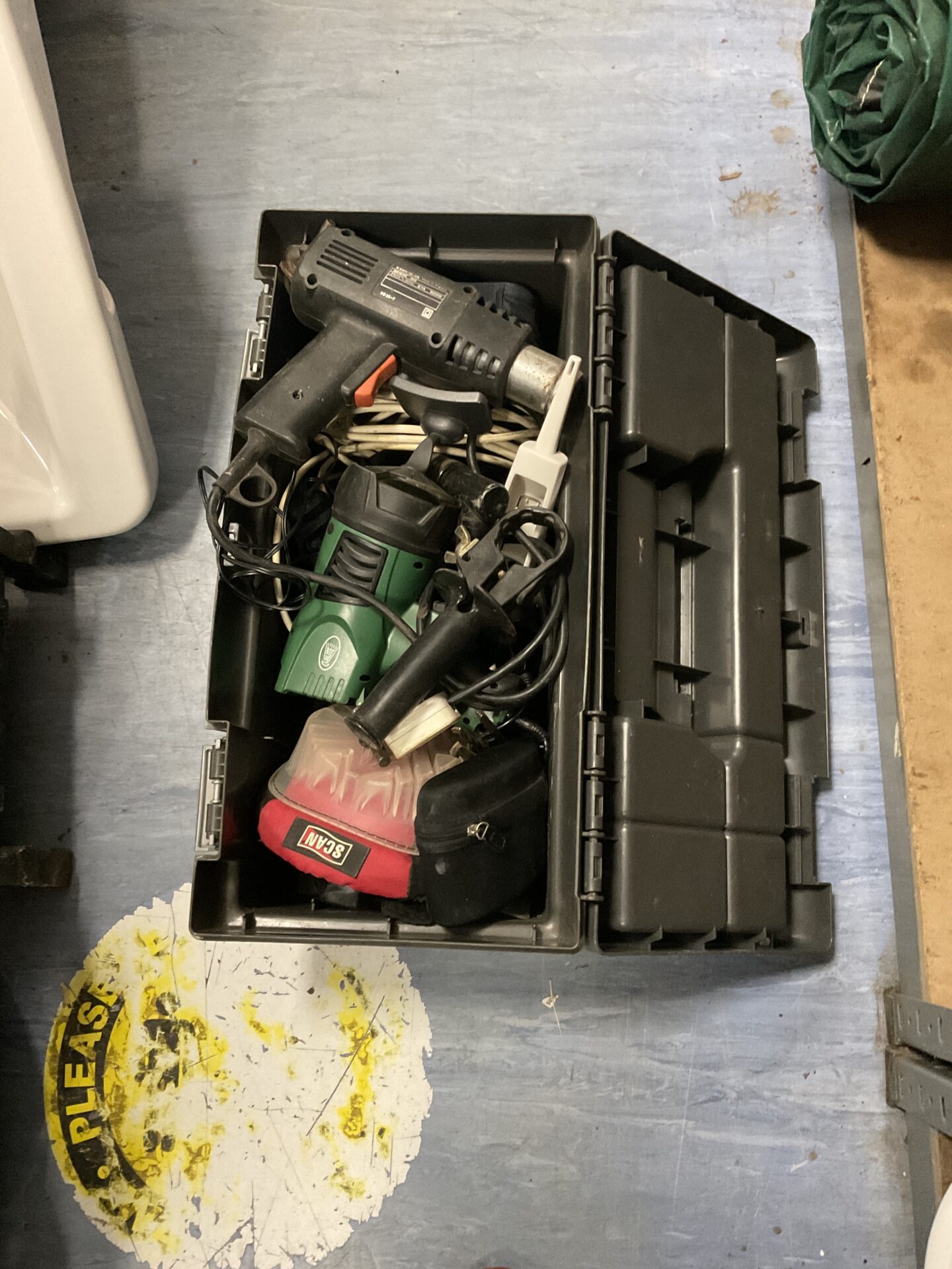 This plastic toolbox contains a variety of hand tools and a heat gun. The toolbox itself is a robust plastic construction, designed for portability and storage. The contents appear to include a heat gun, screwdrivers, pliers, and other assorted tools commonly used for DIY projects and general repairs.