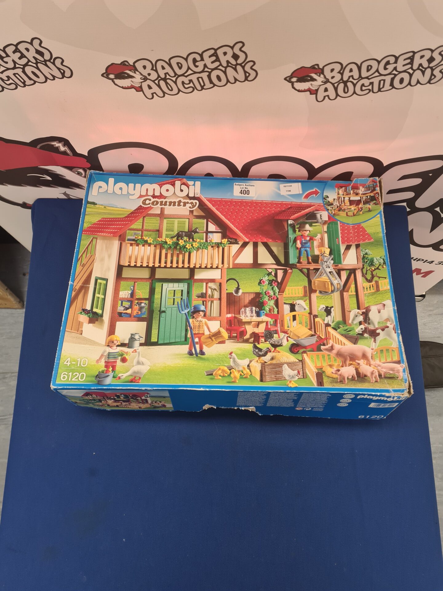 This is a boxed Playmobil Country playset, model number 6120. The set depicts a detailed farm scene, complete with a barn, fencing, figures, and various farm animals. It’s a colourful and engaging playset designed to encourage imaginative play, and is typical of the quality and detail found in vintage Playmobil sets.