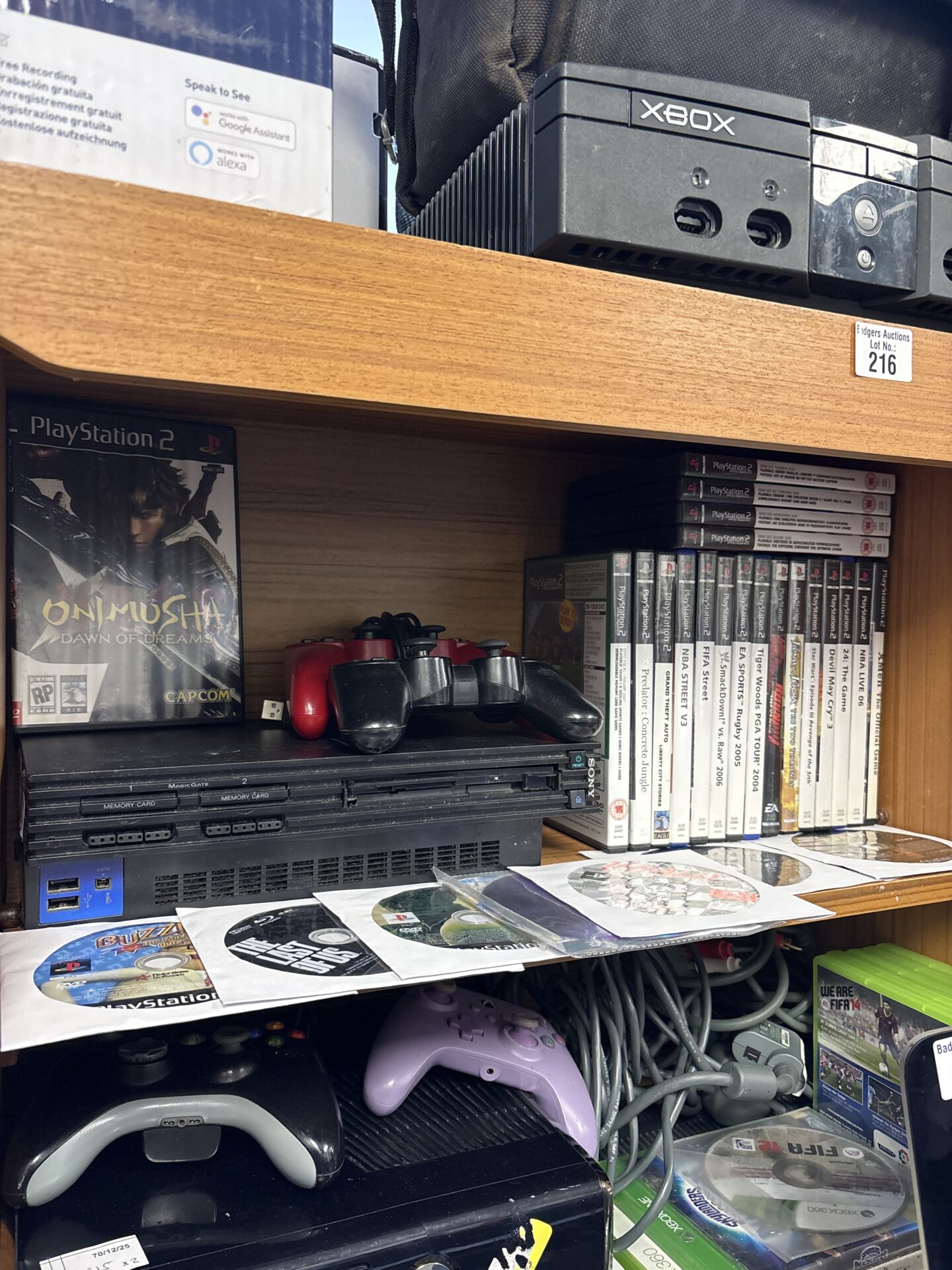 This lot features a Sony PlayStation 2 console, model number SCPH-70012. The console is accompanied by a selection of games and controllers, offering a complete package for retro gaming enthusiasts. The PlayStation 2 was a hugely popular console, known for its extensive game library and DVD playback capabilities.