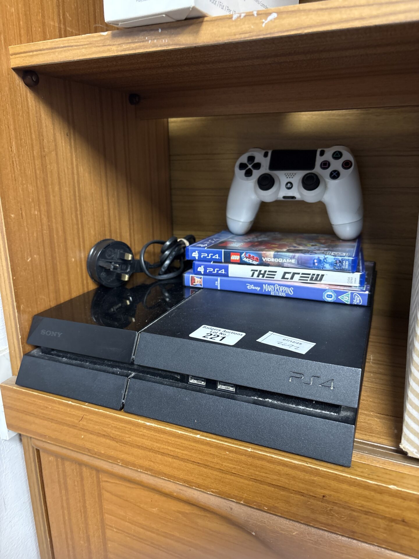 This listing features a Sony PlayStation 4 gaming console. The console is accompanied by a controller and several game titles, offering a complete entertainment package. The PlayStation 4 is known for its high-performance graphics and immersive gaming experience, making it a popular choice for gamers of all levels.