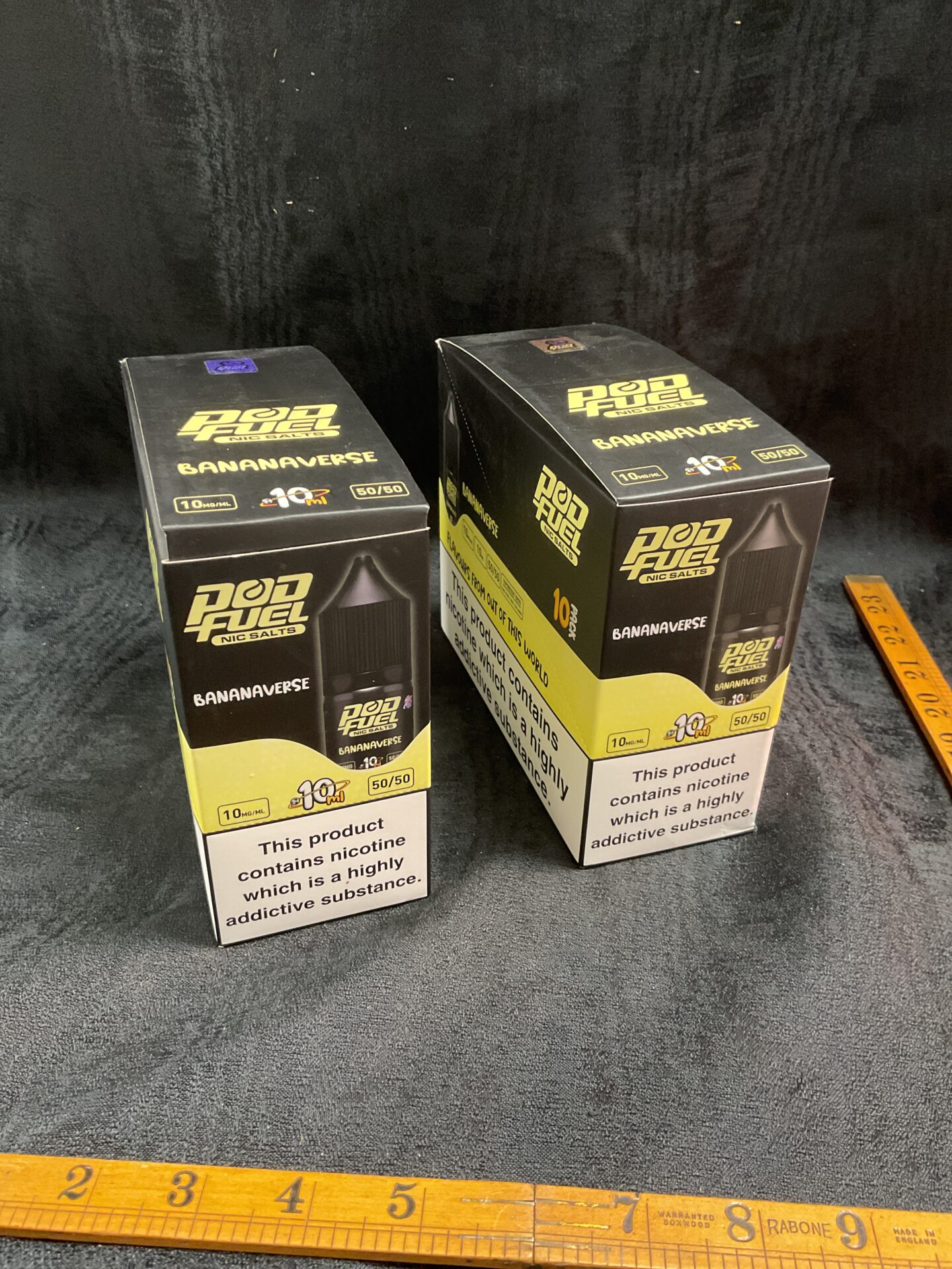 This lot comprises two packs of Pod Fuel Bananaverse e-liquid, each containing ten 10ml bottles. The flavour profile is banana, designed for use with pod systems. The packaging features bold branding and clearly indicates the nicotine content.