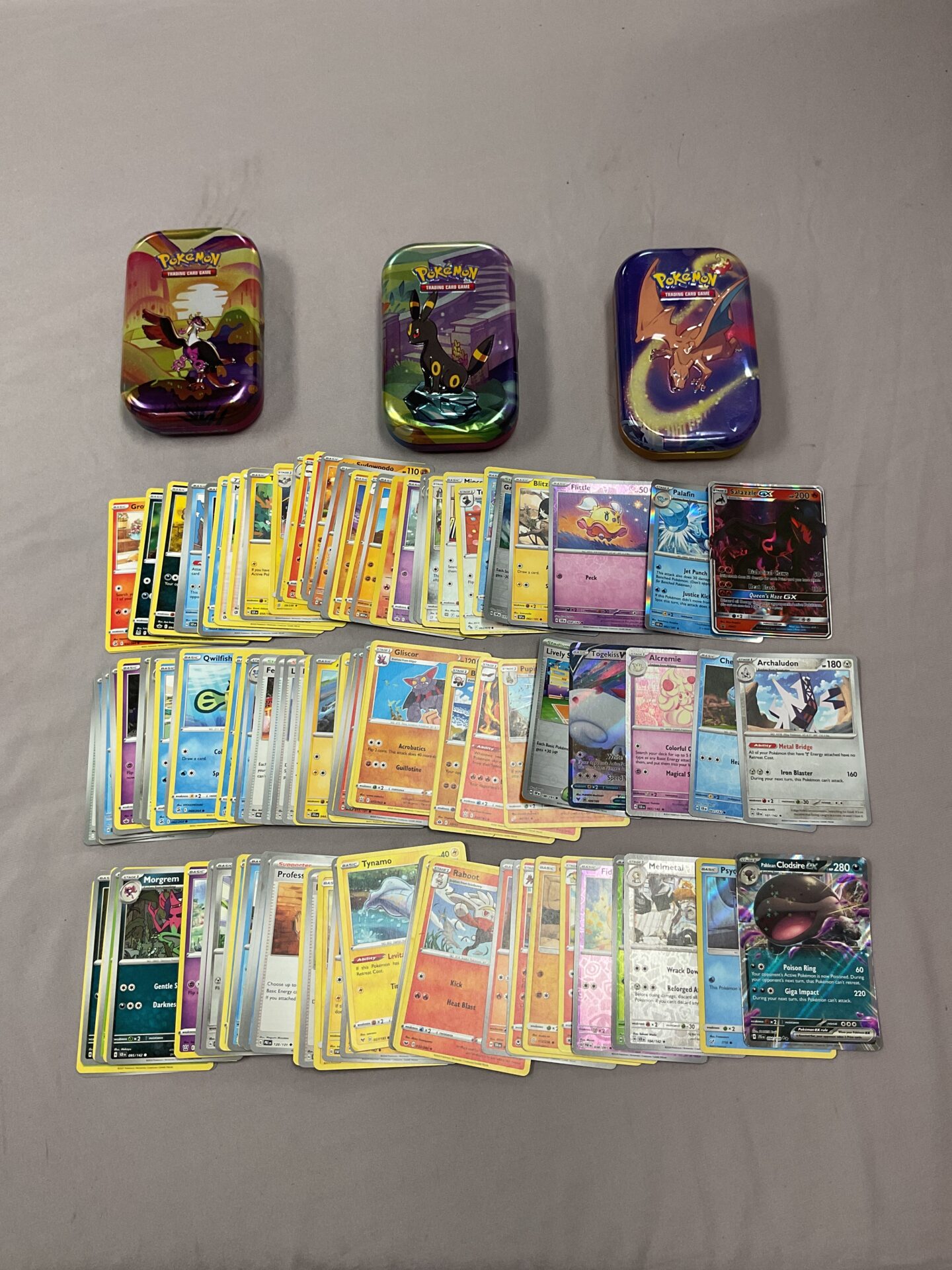This lot features a diverse collection of Pokemon trading cards, primarily housed within collectible tins. The assortment includes a variety of card types, with a notable presence of holographic (holo) cards, adding to their visual appeal and collectibility. This collection offers a great starting point for new collectors or a welcome addition to an existing one.