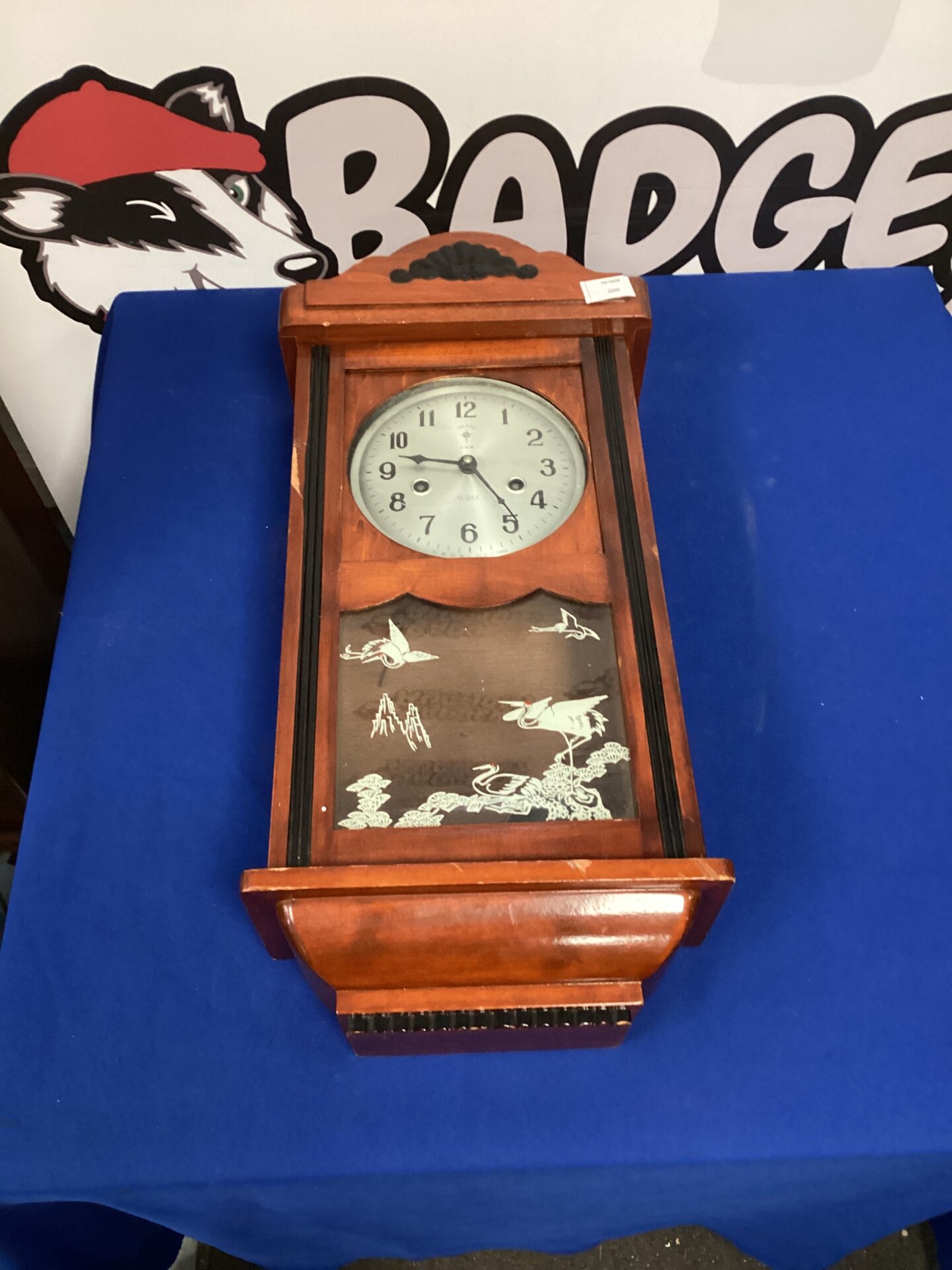 This vintage Polaris wall clock is a beautiful addition to any home. Featuring a wooden case, pendulum mechanism, and key-wind movement, this clock is both functional and decorative. Complete with its original key and pendulum, it’s ready to display and enjoy.