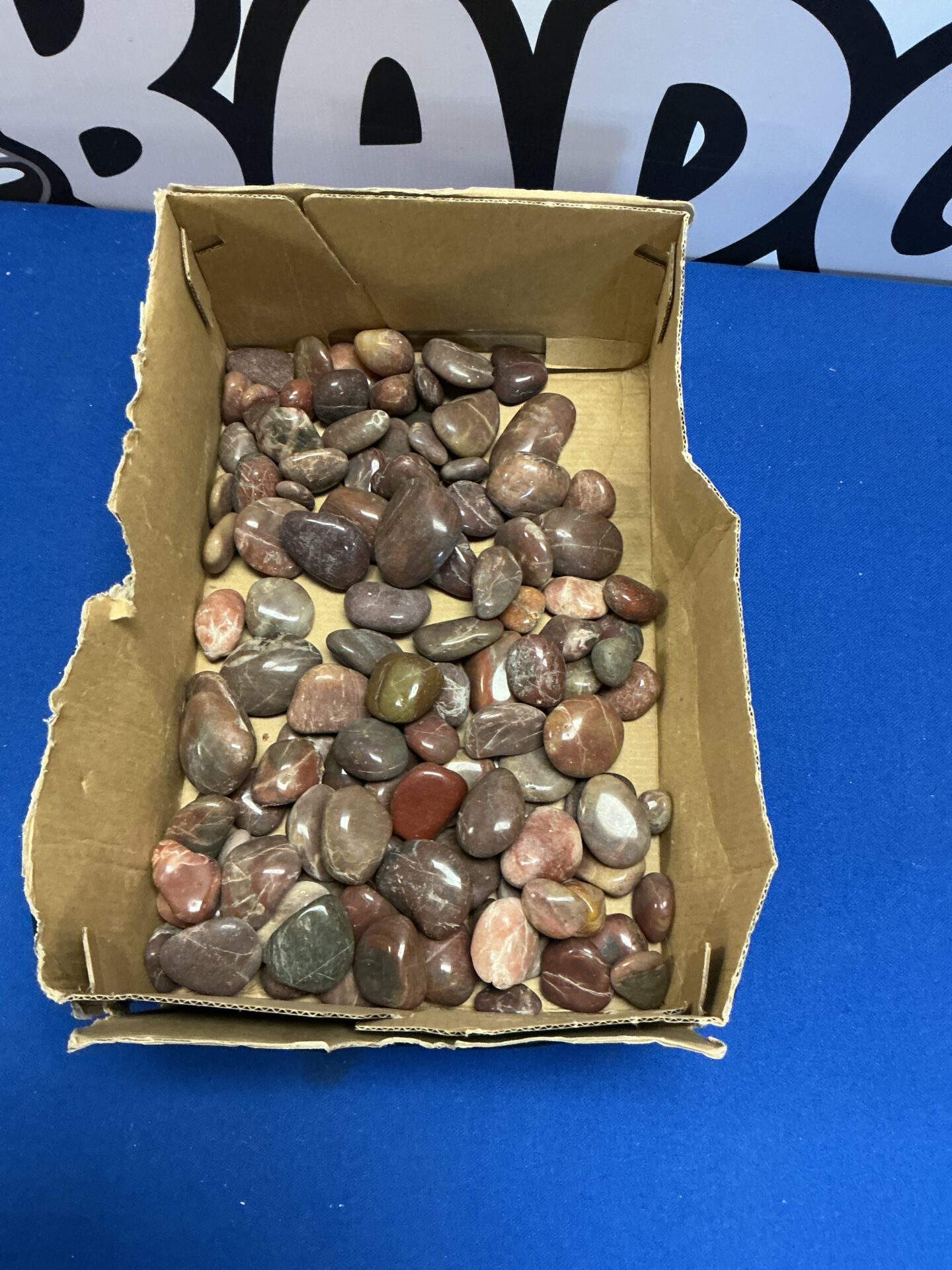 The pebbles appear to be in excellent condition, retaining their polished sheen and smooth texture. This lot would be of interest to rock collectors, crafters, or anyone seeking natural decorative elements for their home or garden. Their versatility and aesthetic appeal make them a desirable addition to any collection or project.