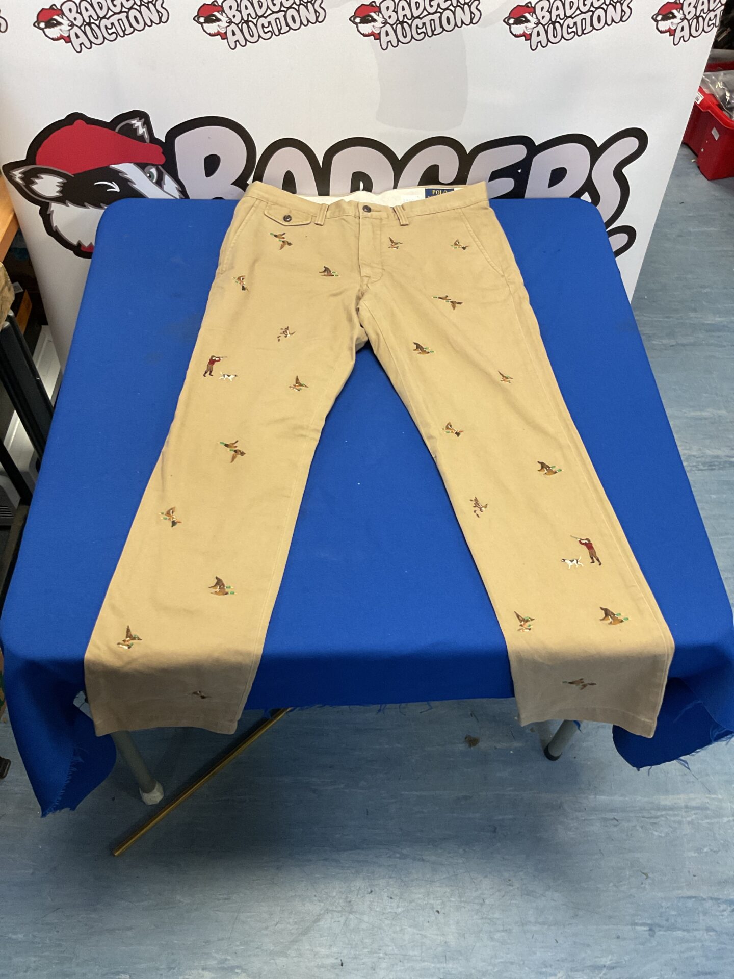 These chinos appear to be in good pre-owned condition, showing minimal signs of wear. The duck embroidery remains vibrant and intact, adding to their unique appeal. These pants would be a great addition to a collector of Ralph Lauren or preppy fashion, or for anyone looking for a stylish and comfortable pair of chinos with a distinctive design.