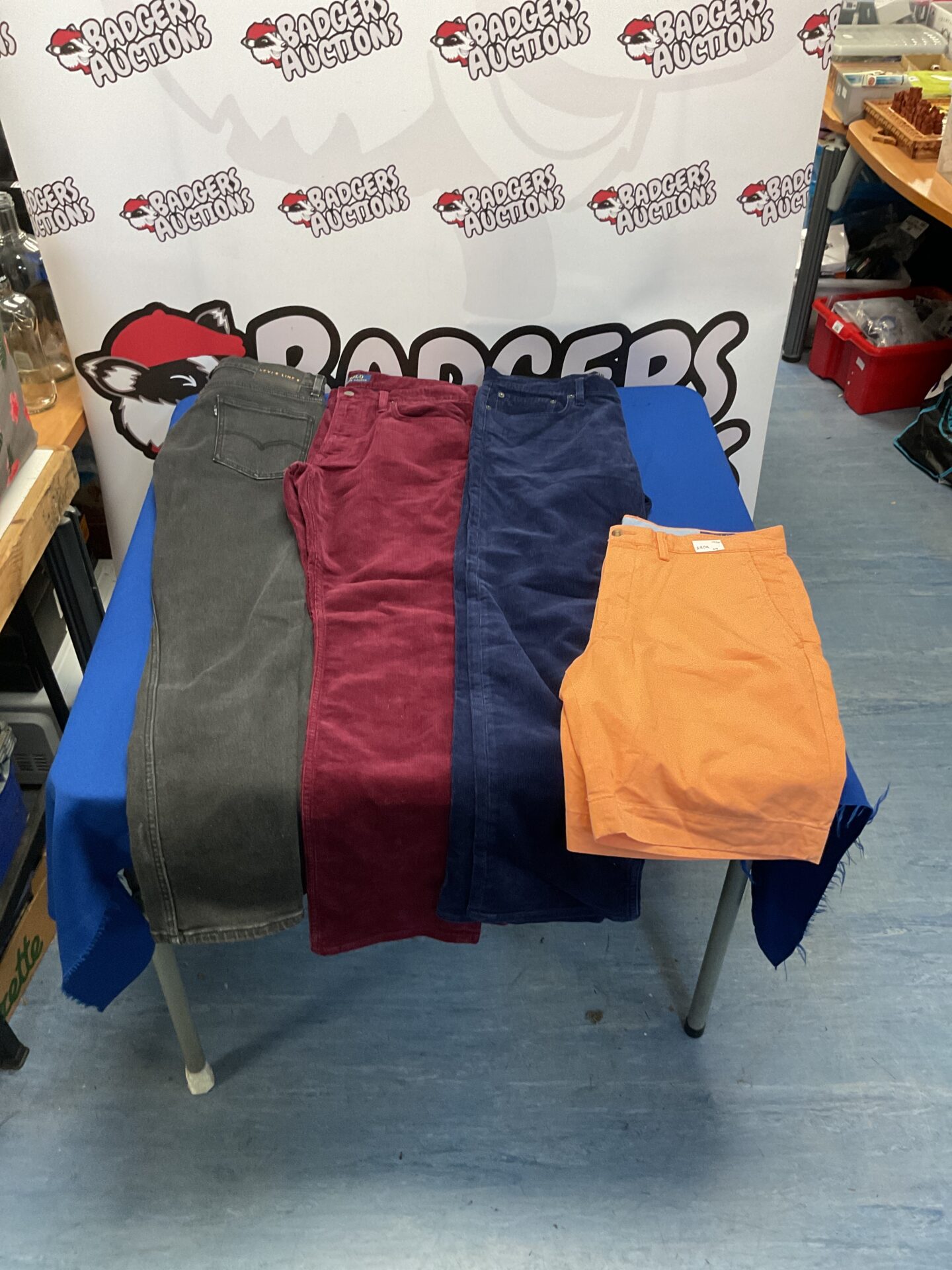 This lot features a selection of denim from Polo Ralph Lauren and Levi’s. Included are two pairs of Polo Ralph Lauren jeans, alongside a pair of Polo Ralph Lauren shorts, and a single pair of Levi’s jeans. This collection offers a variety of styles and fits for casual wear, representing classic American denim brands.