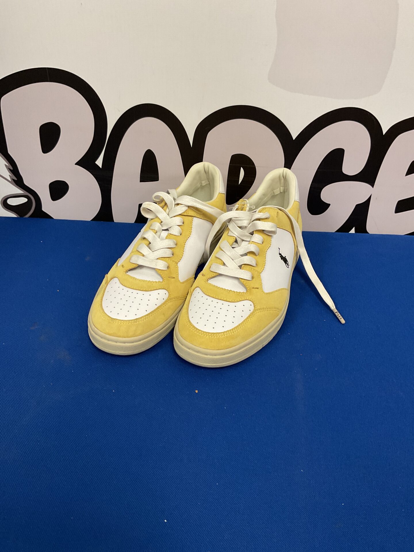 These classic Polo Ralph Lauren Masters Court sneakers showcase a sophisticated blend of style and comfort. Crafted from supple suede in a vibrant yellow hue, these sneakers feature a clean, minimalist design with white detailing and a durable rubber sole. The iconic Polo Ralph Lauren branding adds a touch of heritage and quality, making these sneakers a versatile addition to any wardrobe.
