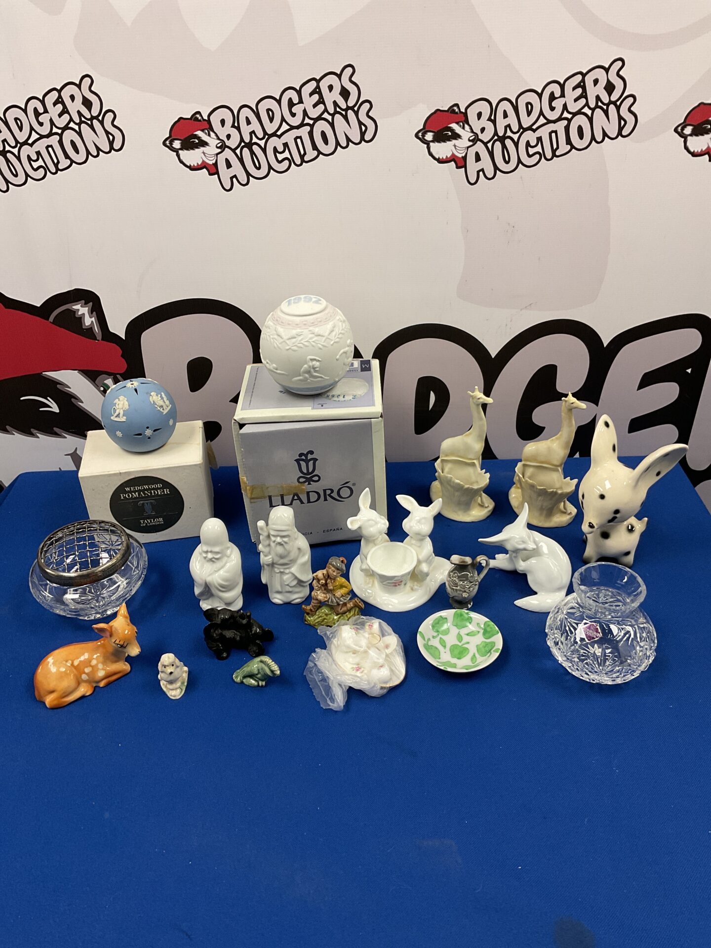 This tray presents a selection of porcelain collectables, featuring pieces from renowned makers such as Lladro, Wedgwood, and Wade. The collection includes various figurines and decorative ornaments, showcasing the craftsmanship and artistry associated with these brands. The pieces exhibit a range of styles and designs, reflecting the diverse aesthetic sensibilities of their respective eras.