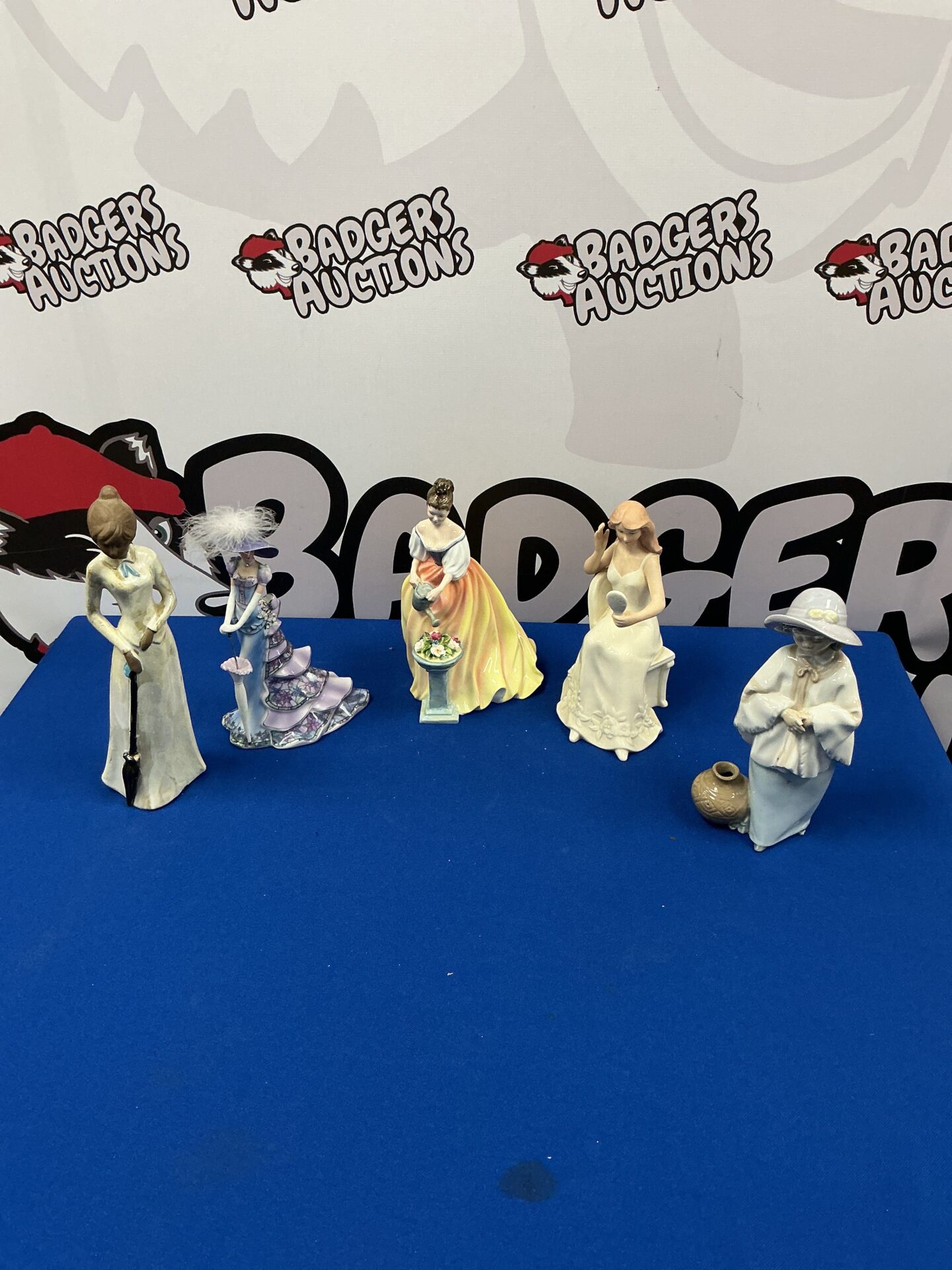 This lot comprises five delicate porcelain lady figures, showcasing the artistry of renowned manufacturers like Royal Doulton and NAO. Each figure depicts a different pose and attire, reflecting the styles and craftsmanship of their respective eras. The figures exhibit fine detailing in their facial features, clothing, and accessories, making them attractive display pieces or additions to a collection.