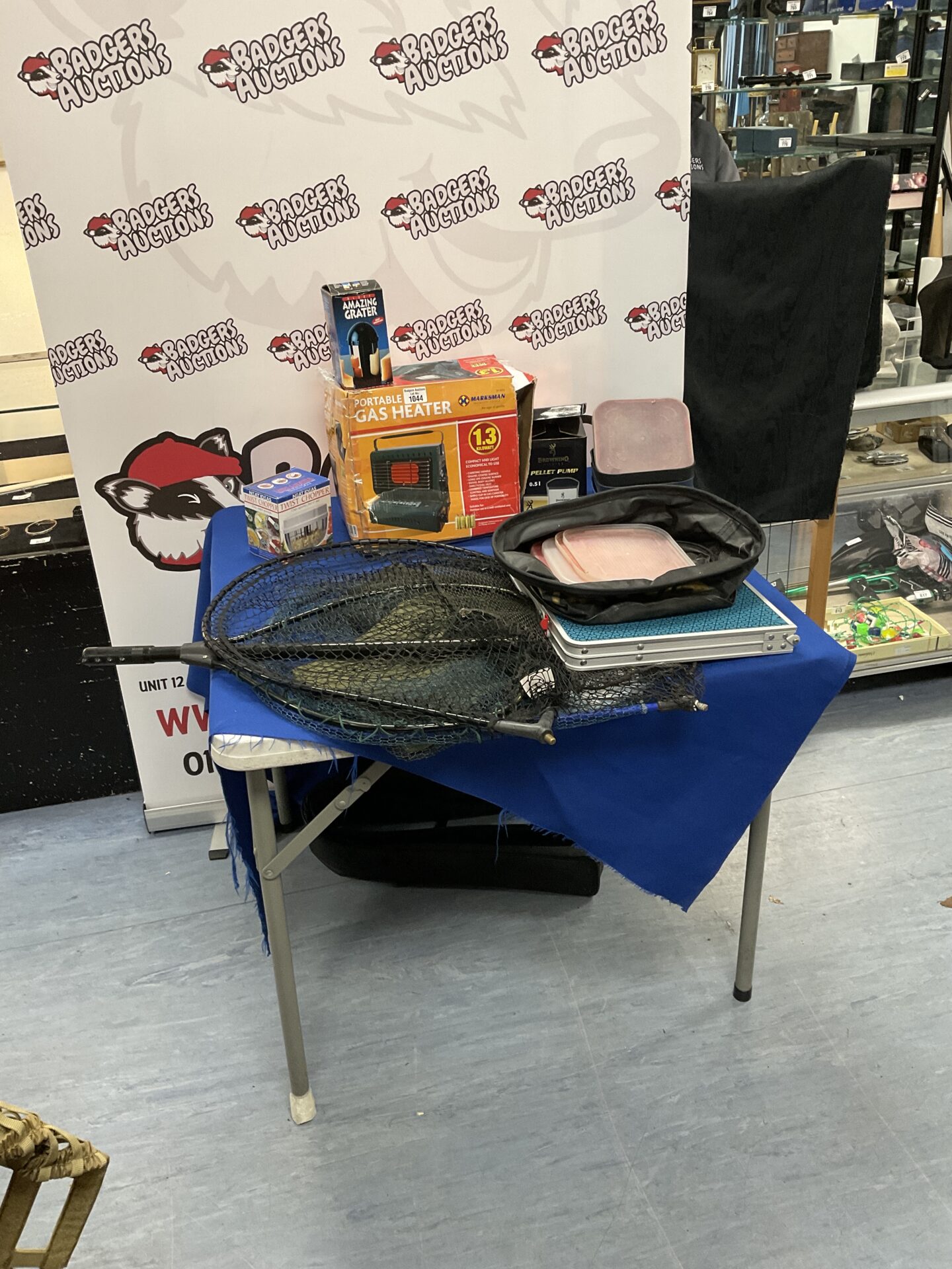 The condition of the heater and accessories is not explicitly stated, and potential buyers should carefully examine the images for any signs of wear or damage. This lot may appeal to collectors of vintage camping equipment or those seeking affordable outdoor heating solutions. The inclusion of fishing accessories adds to its versatility and potential value.