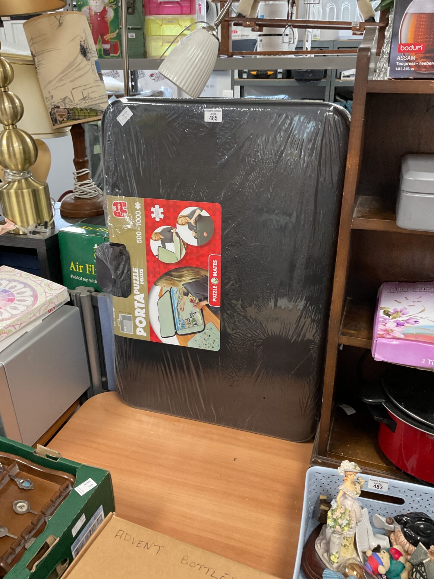 This Portapuzzle Deluxe appears to be a vintage item, showing signs of use consistent with its age. The board has some wear and tear, but remains functional for its intended purpose. It would be a welcome addition to a puzzle enthusiast’s collection or for anyone seeking a dedicated portable puzzle surface.