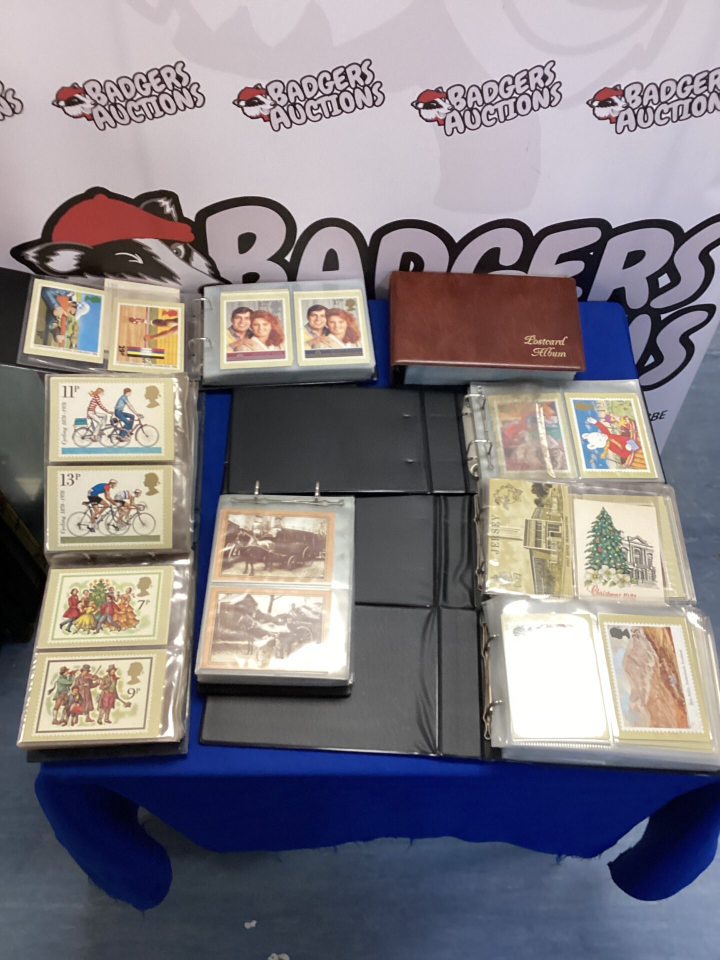 This lot comprises a collection of postcard albums, appearing to contain numerous postcards within. The albums showcase a variety of styles and likely span different eras, offering a glimpse into historical imagery and collecting habits. These albums represent a tangible piece of social history, reflecting the popularity of postcard collecting and sending during their time.