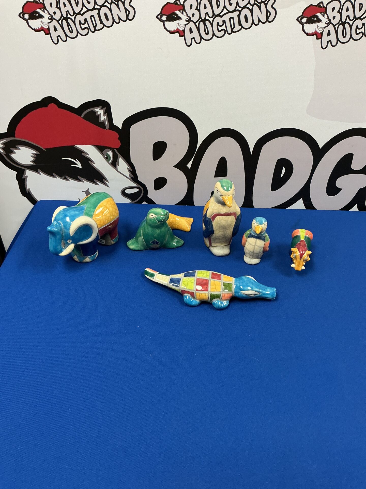 These pottery animal figurines exhibit signs consistent with their handmade nature and age. There may be minor imperfections, such as slight variations in glaze or minor surface wear, which add to their character and authenticity. Collectors of folk art, ceramic animals, or whimsical figurines may find these pieces particularly appealing due to their unique charm and handcrafted quality.