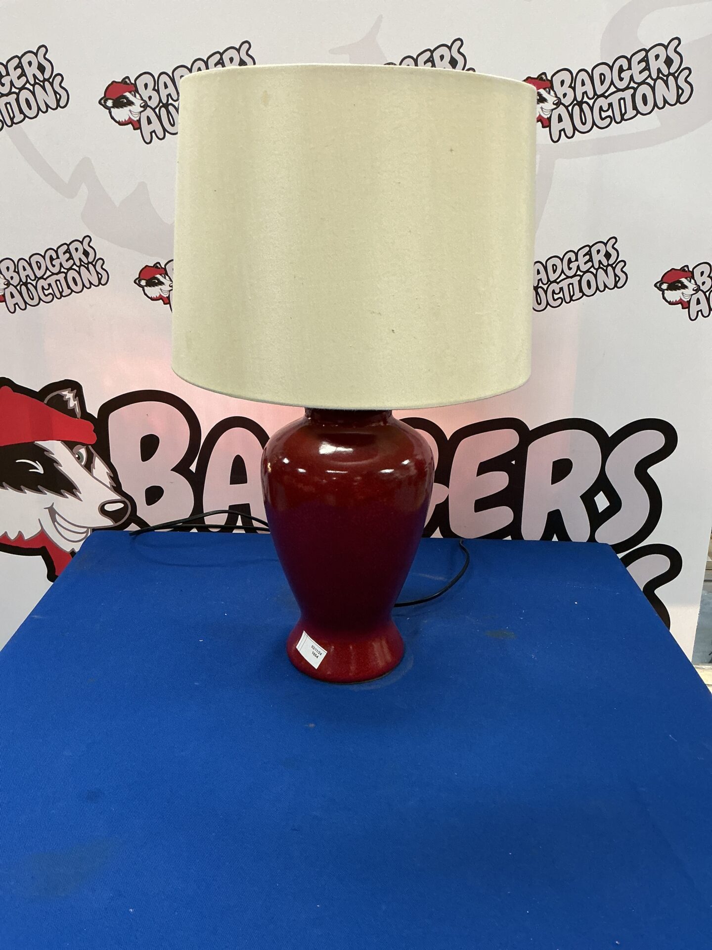 This is a table lamp featuring a pottery-style base. The lamp has a rich red glaze and a classic shape, reminiscent of mid-century modern design. It appears to be constructed with a ceramic or pottery base, providing a warm and inviting glow when illuminated.