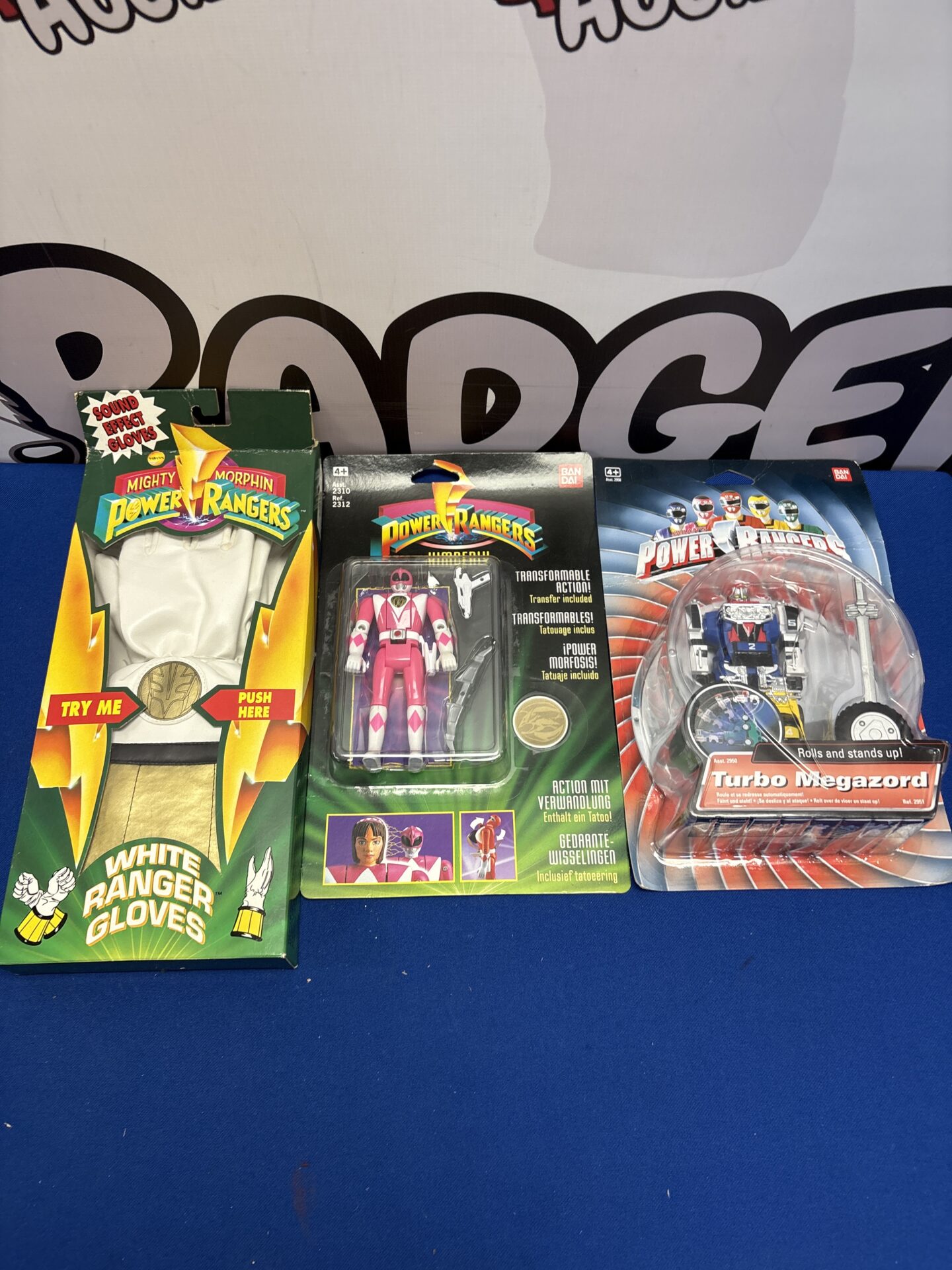 This lot features three boxed Power Rangers toys from Bandai and Saban, representing a nostalgic piece of 90s pop culture. The packaging showcases classic character designs and vibrant artwork, indicative of the era. These toys offer a glimpse into the popular television series and its associated merchandise, appealing to fans and collectors alike.