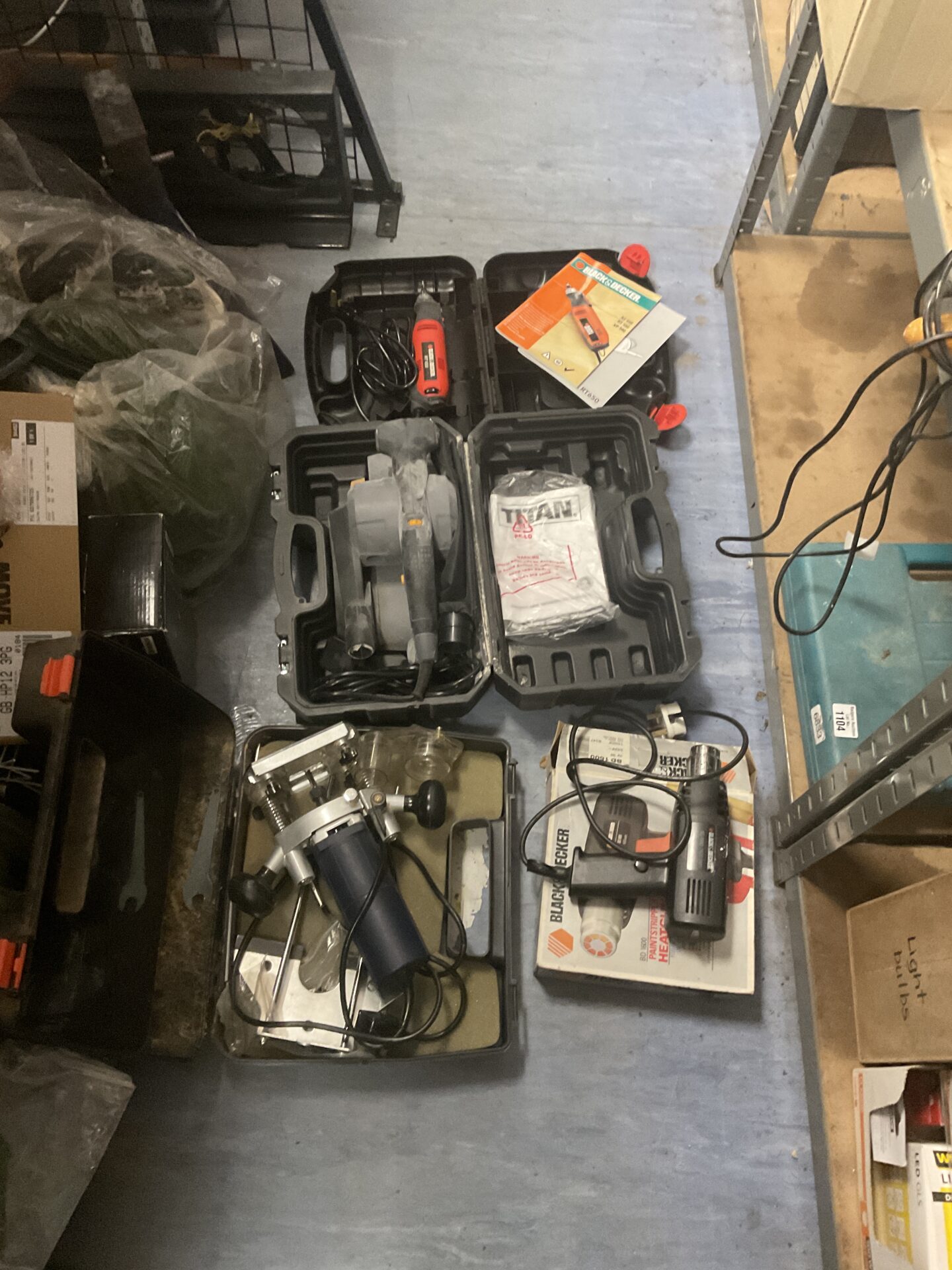 This lot comprises four power tools, including items from Black & Decker and Titan. The bundle appears to include a cordless drill, a reciprocating saw, and two other handheld power tools, all presented within their original carrying cases. These tools are designed for a variety of DIY and home improvement tasks, offering versatility for the home handyman or professional tradesperson.