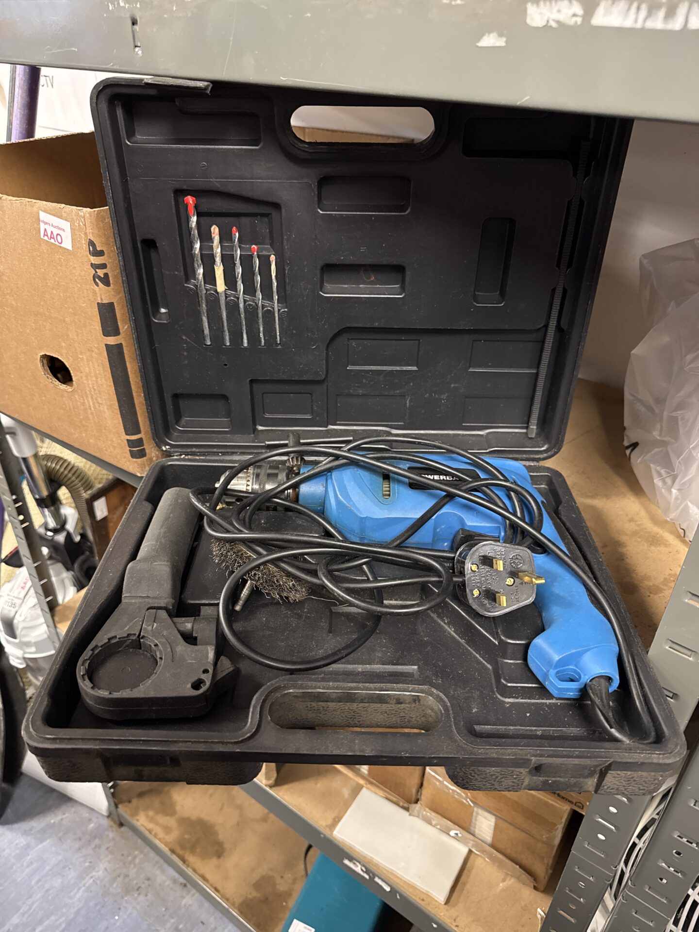 This lot features a Powerbase drill set, presented within its original carrying case. The drill itself is a corded electric model, designed for various DIY tasks around the home or workshop. The set appears to include a selection of drill bits, offering versatility for different materials and applications.