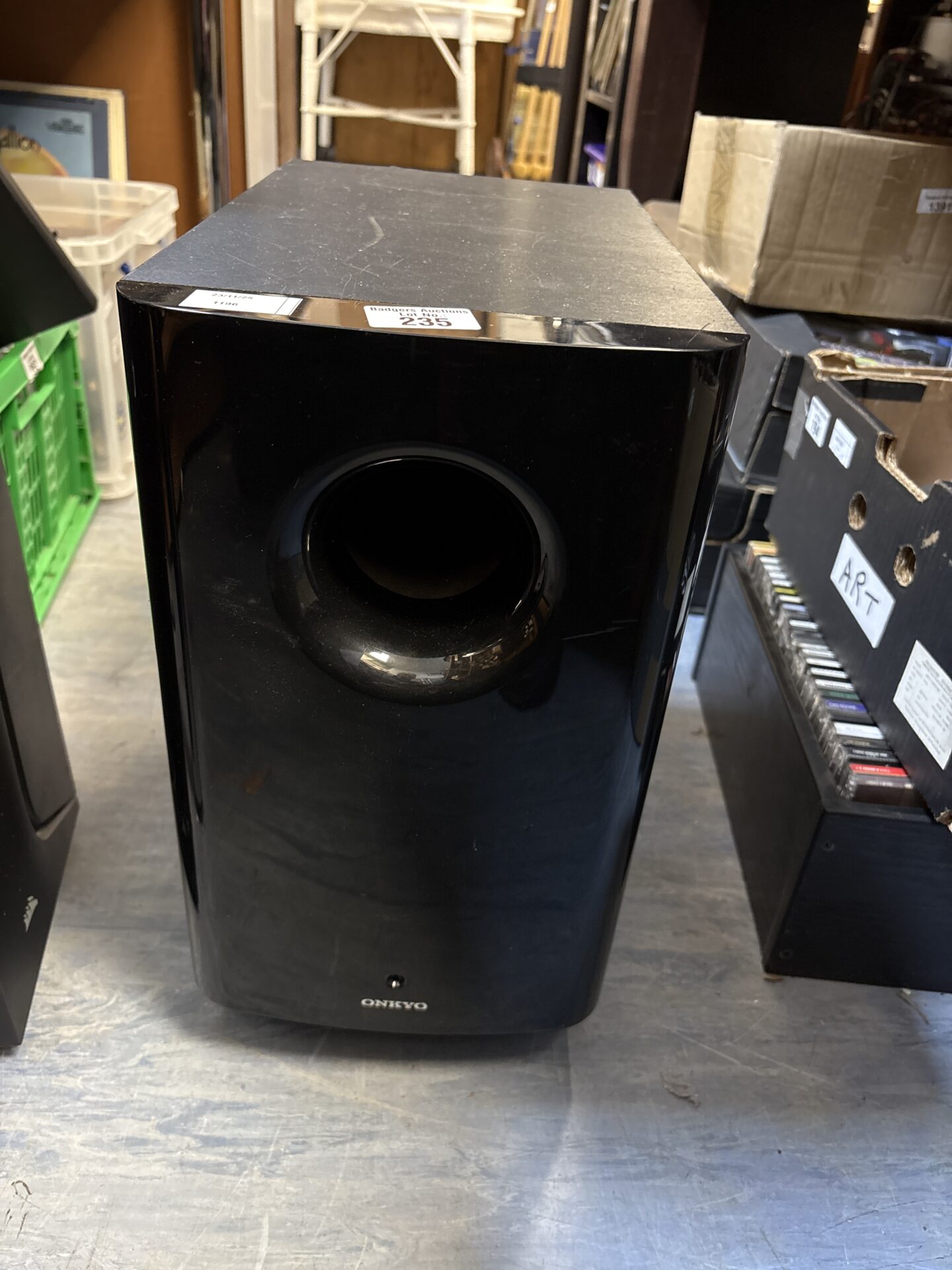 This is an Onkyo powered subwoofer, model SKW-501E. Designed to enhance the low-frequency audio experience, this unit is intended to be integrated into a home theatre or stereo system. The black cabinet is designed to blend into most home entertainment setups, and the unit is intended to deliver a powerful bass response.