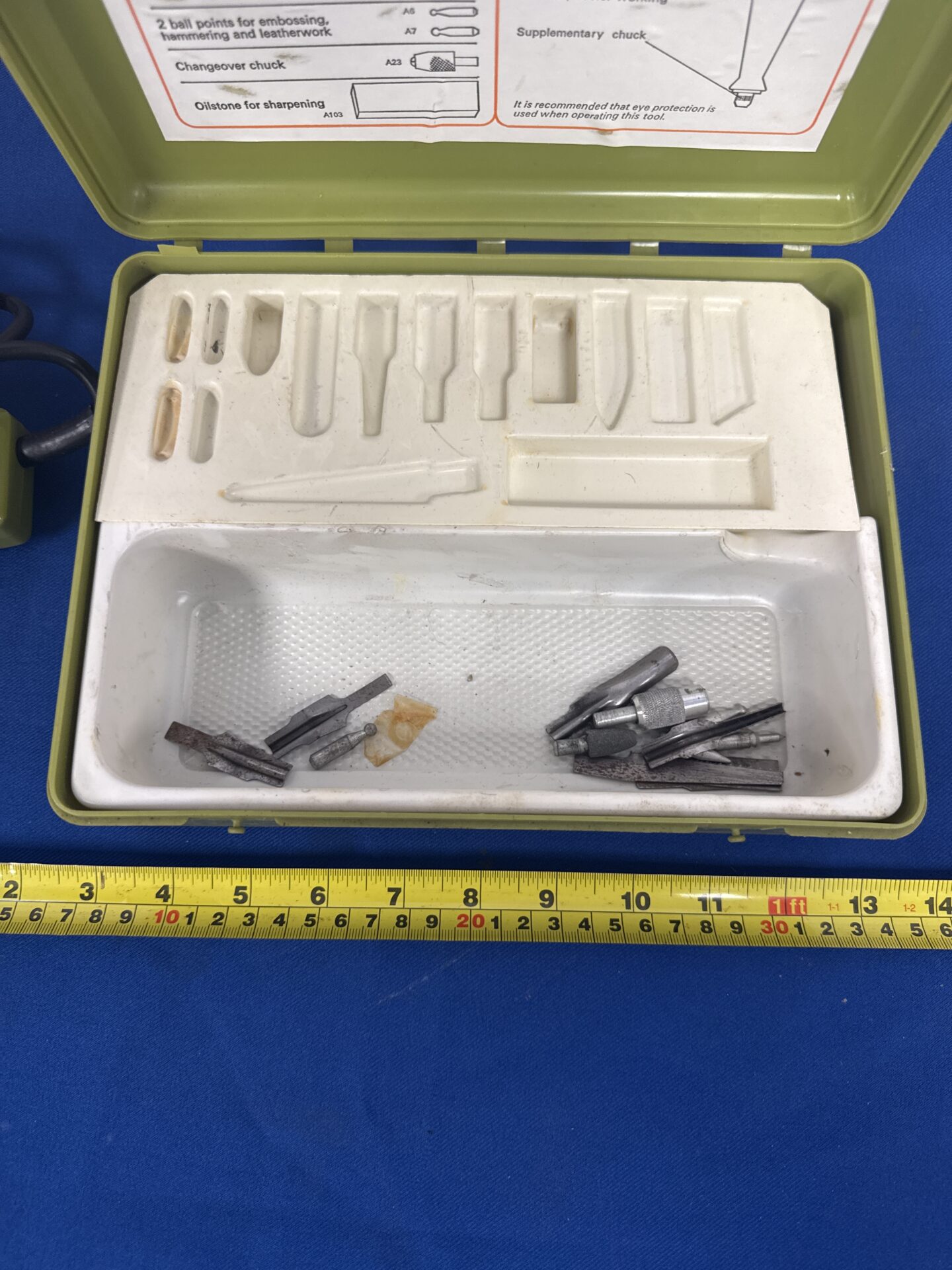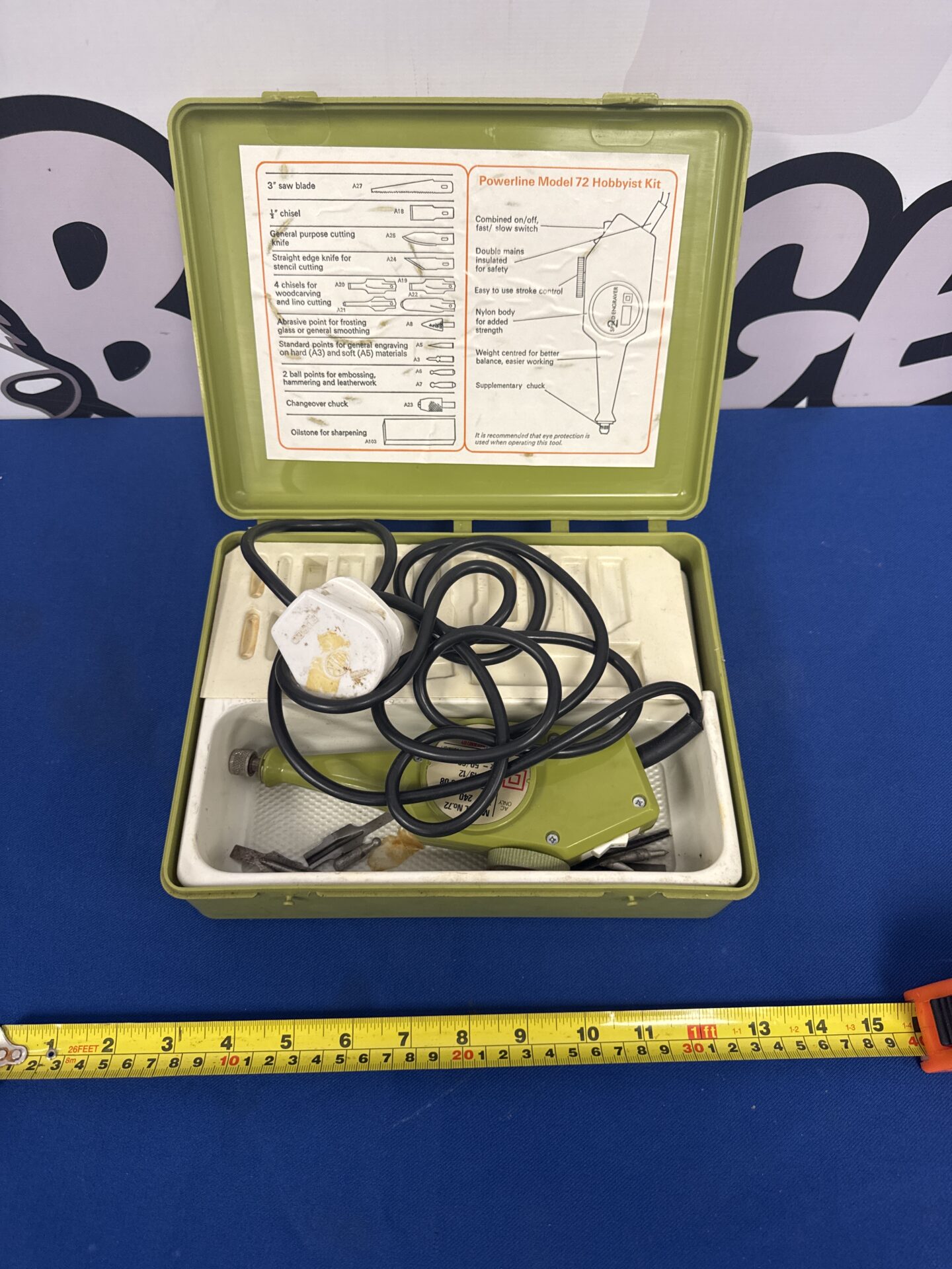 The kit appears to be in good vintage condition, with the case showing some signs of wear consistent with age and use. All the attachments are present and accounted for, though some may show minor wear from previous use. This Powerline Model 72 kit is a desirable find for collectors of vintage tools, hobbyists, and those interested in retro crafting equipment.