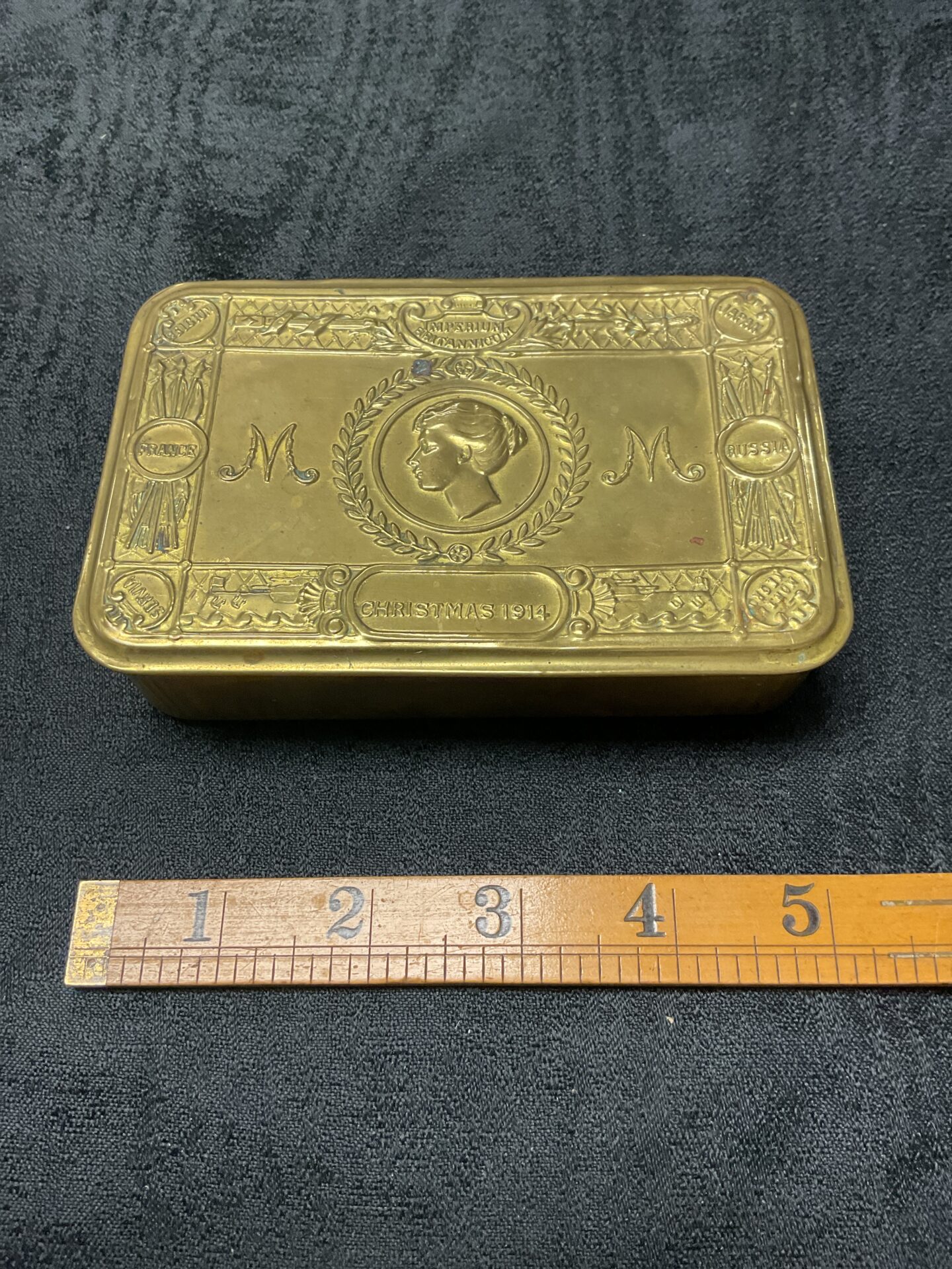 This particular box exhibits signs of age and wear consistent with its historical context, adding to its authenticity and charm. While there may be minor imperfections or patina, these are indicative of its journey through time and do not detract from its overall appeal. This Princess Mary Gift Fund box is a wonderful piece for collectors of WWI memorabilia, military history enthusiasts, or anyone seeking a meaningful and historically significant item.