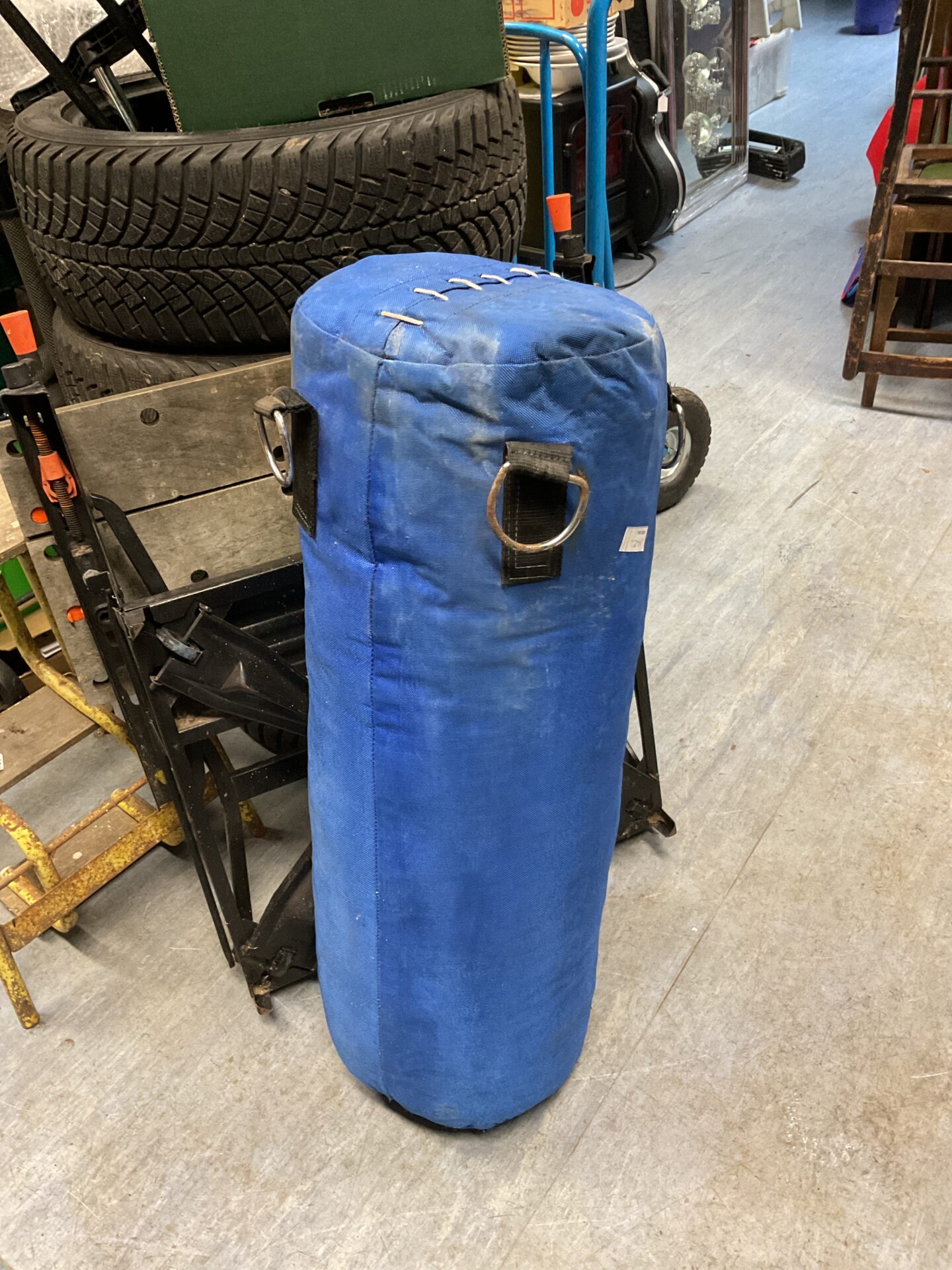 This blue punch bag is a durable training tool for boxing and fitness enthusiasts. Showing signs of use, it’s structurally sound with intact hanging straps. Ideal for home gyms or collectors of vintage sports equipment.