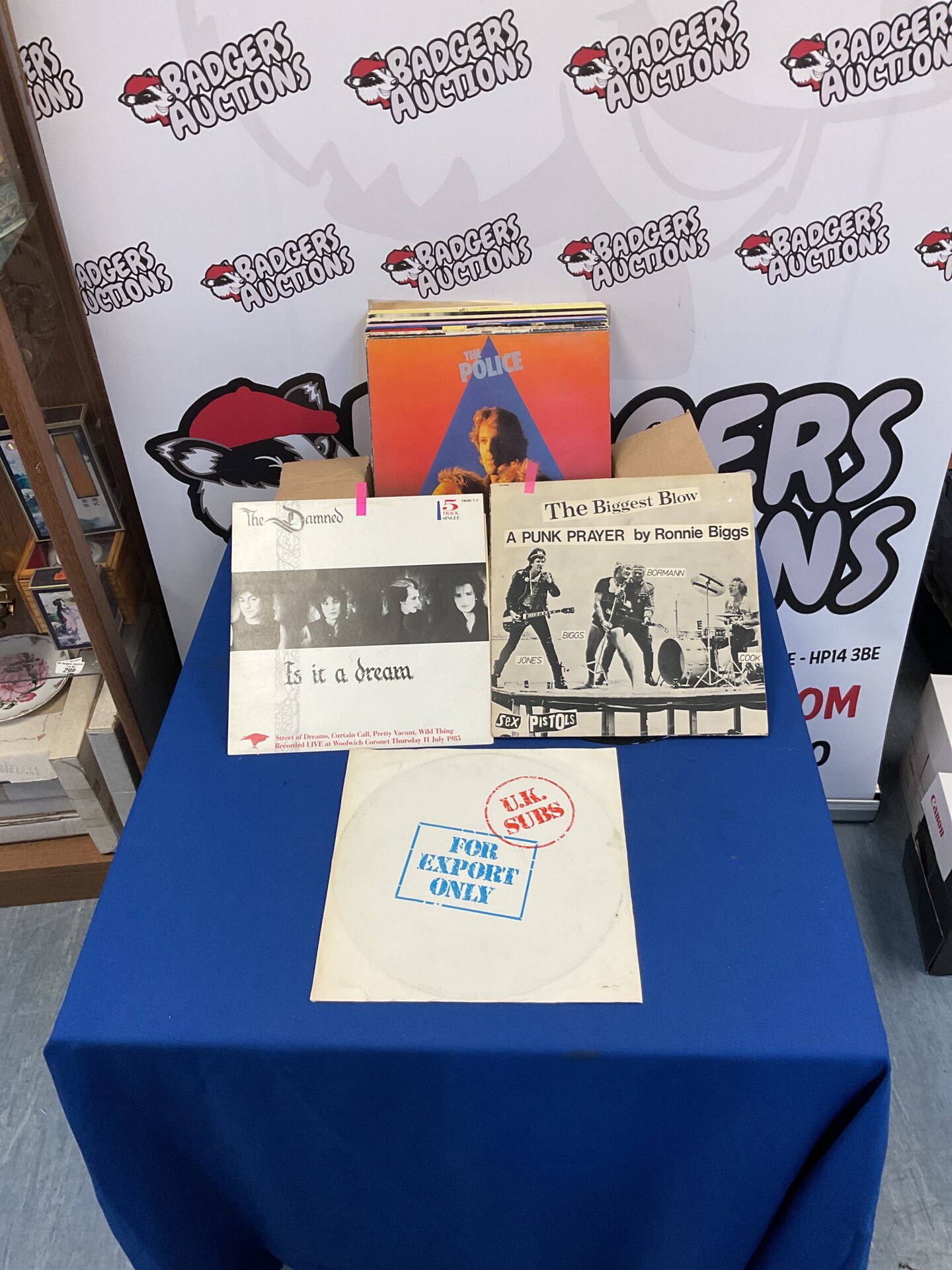 This lot comprises a collection of punk LPs and 12” singles, representing a snapshot of the influential punk rock movement. The collection includes material from iconic bands such as Sex Pistols and The Damned, offering a glimpse into the raw energy and rebellious spirit of the era. These records are a testament to a pivotal moment in music history, capturing the sound and attitude of a generation.