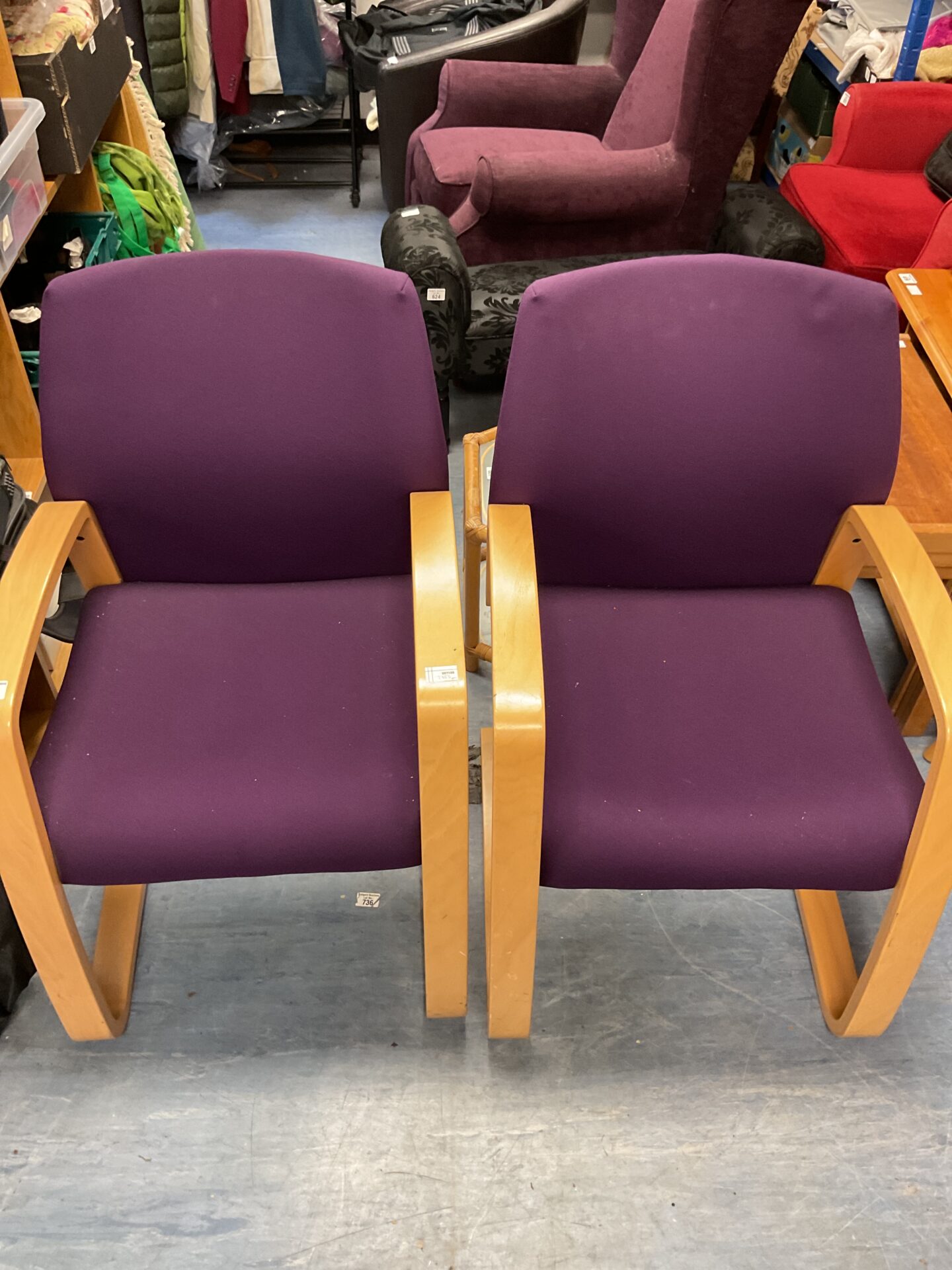 This lot comprises two open armchairs, upholstered in a vibrant purple fabric. The chairs feature a sculpted wooden frame, with gently curved arms and legs, suggesting a mid-century modern aesthetic. The open arm design provides a comfortable and inviting seating experience, while the colour adds a bold statement to any room.