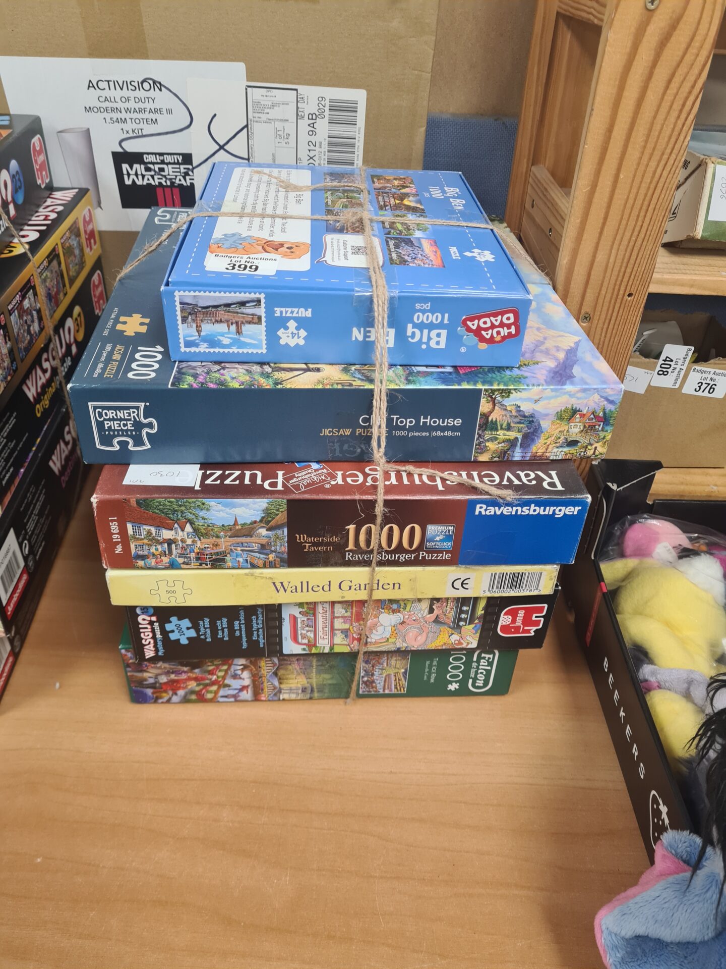 This is a bundle of assorted jigsaw puzzles, including a Ravensburger puzzle. The lot contains a variety of themes and piece counts, offering a diverse selection for puzzle enthusiasts. Included is a Call of Duty puzzle, adding a gaming element to the collection.