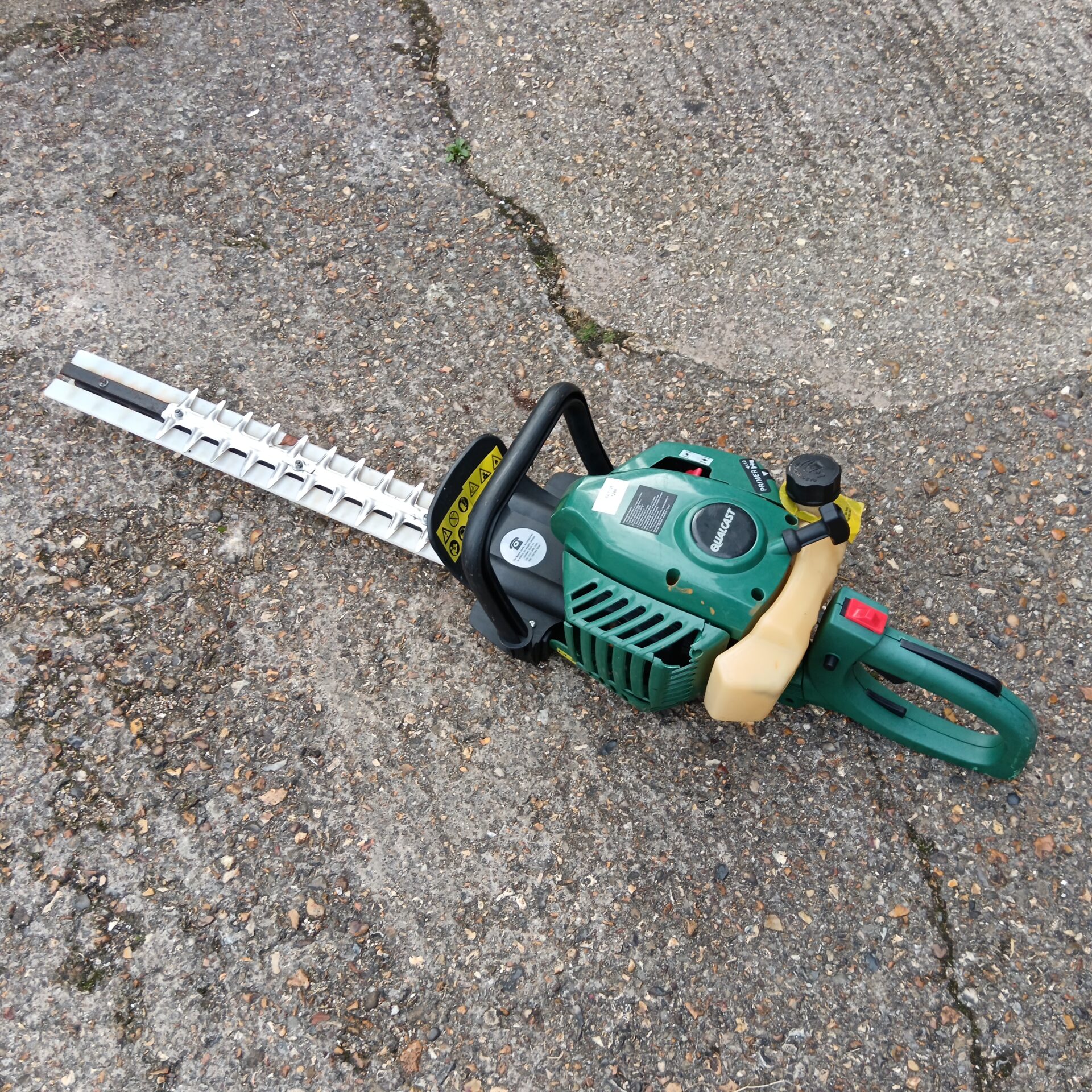 This is a Qualcast petrol hedge cutter, designed for maintaining gardens and landscaping. It features a petrol engine for power and portability, allowing for cordless operation around the garden. The cutter is designed to trim hedges and shrubs efficiently, offering a convenient solution for garden maintenance.