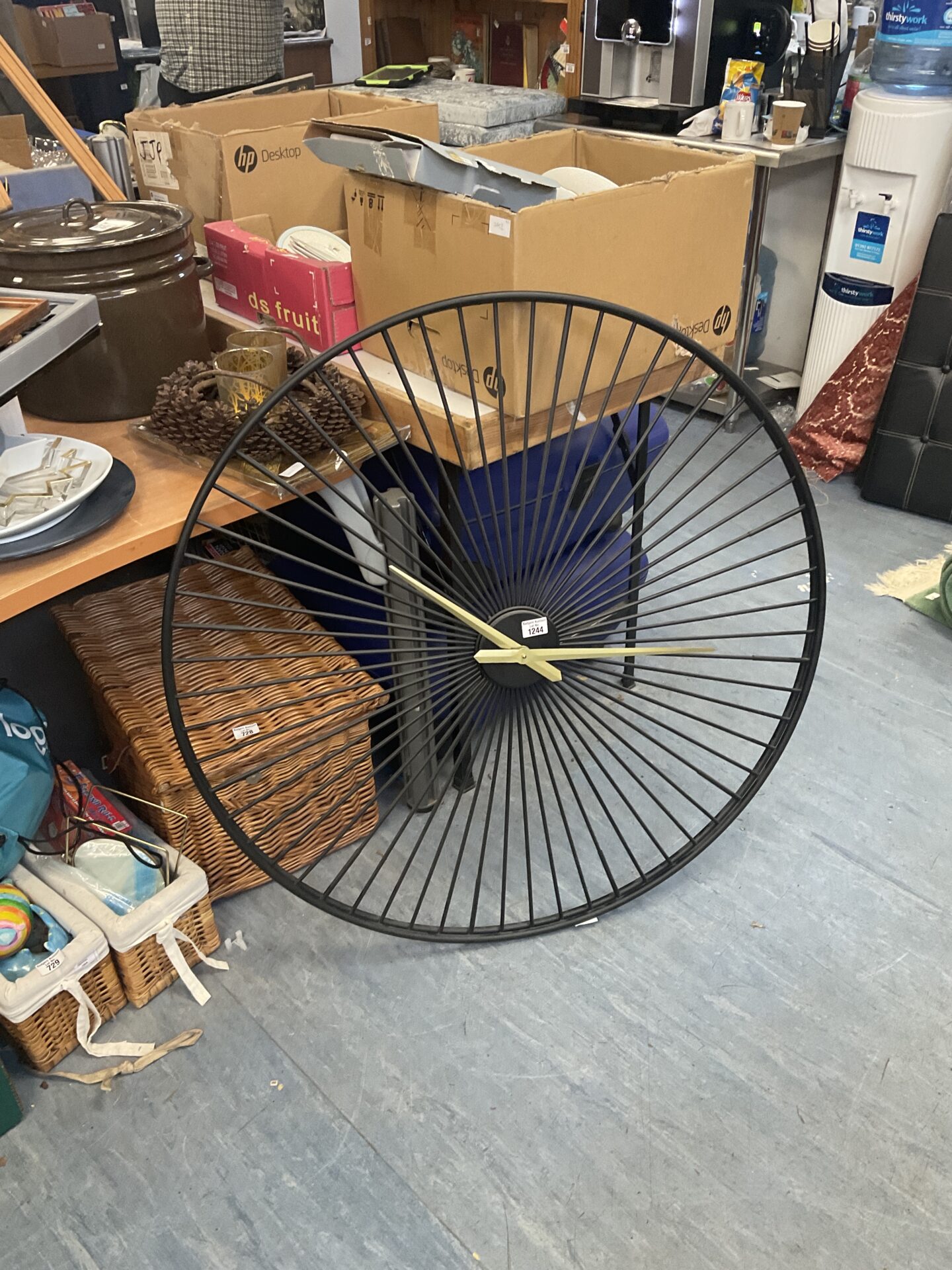 This is a large, striking quartz wall clock with a unique wheel-style design. Constructed from metal, it presents an industrial aesthetic, making it a bold statement piece for any room. The open-faced design allows a clear view of the clock mechanism, adding to its modern and minimalist appeal.