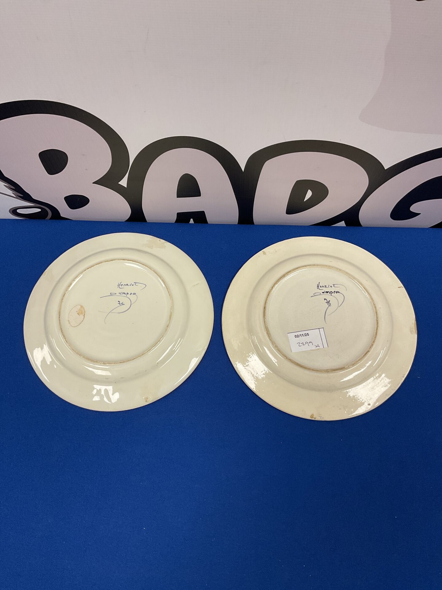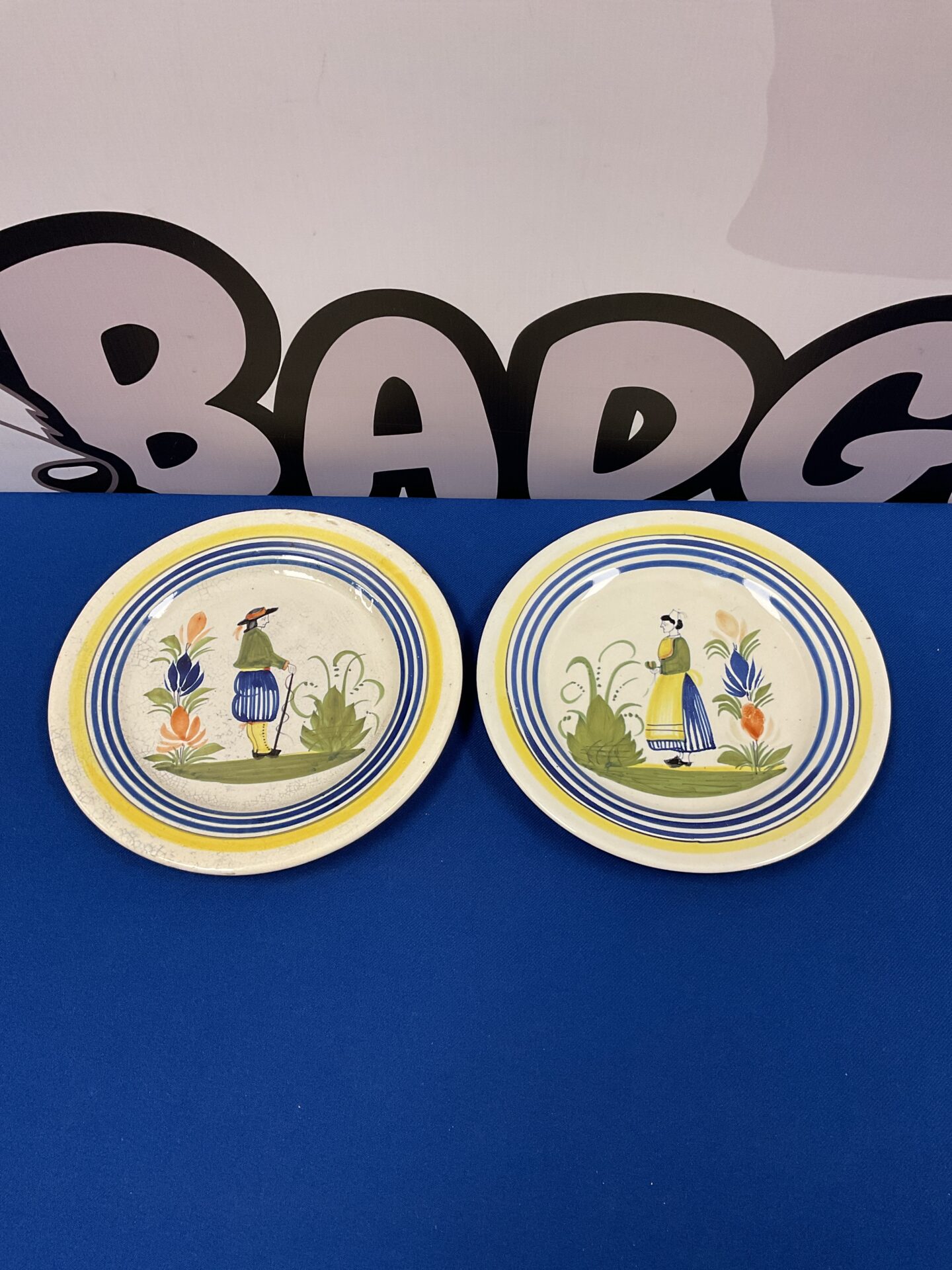 These are two charming Quimper plates, each depicting a traditional Breton figure. Signed ‘Henriot’, these plates showcase the distinctive style of Quimper pottery, known for its hand-painted designs and vibrant colours. The plates feature a classic floral border and a scene of a man and a woman in traditional attire, typical of the region’s cultural heritage.