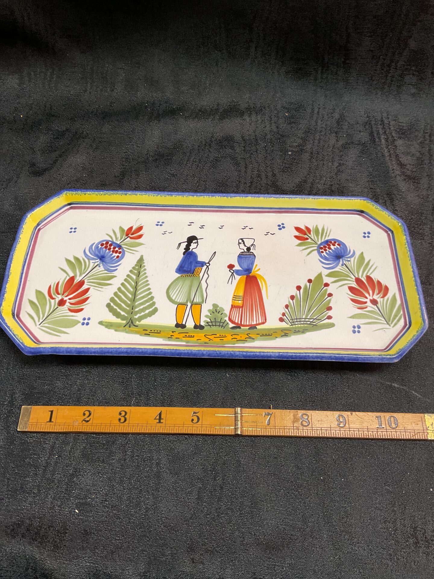 This charming sandwich plate is a beautiful example of traditional Quimper pottery from France. Hand-painted with a delightful scene of a Breton man and woman in traditional attire, it showcases the distinctive style and craftsmanship of Quimper Faience. The plate features a scalloped edge and vibrant colours, typical of this renowned pottery.