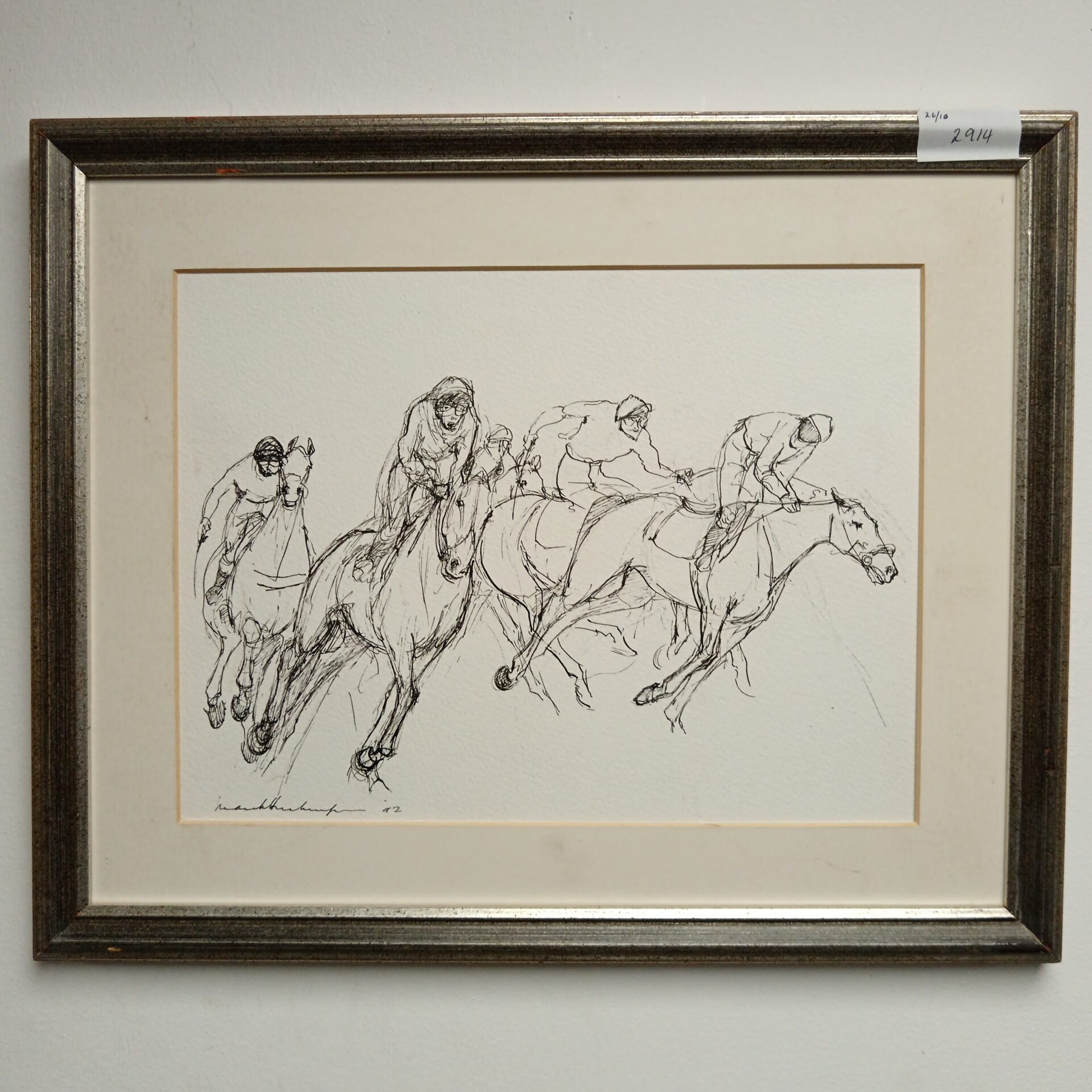 This is an original ink drawing depicting a dynamic scene of race horses in motion. The artist has skillfully captured the energy and musculature of the horses with fluid lines and expressive detail. The piece is signed by the artist, adding to its collectibility and authenticity.