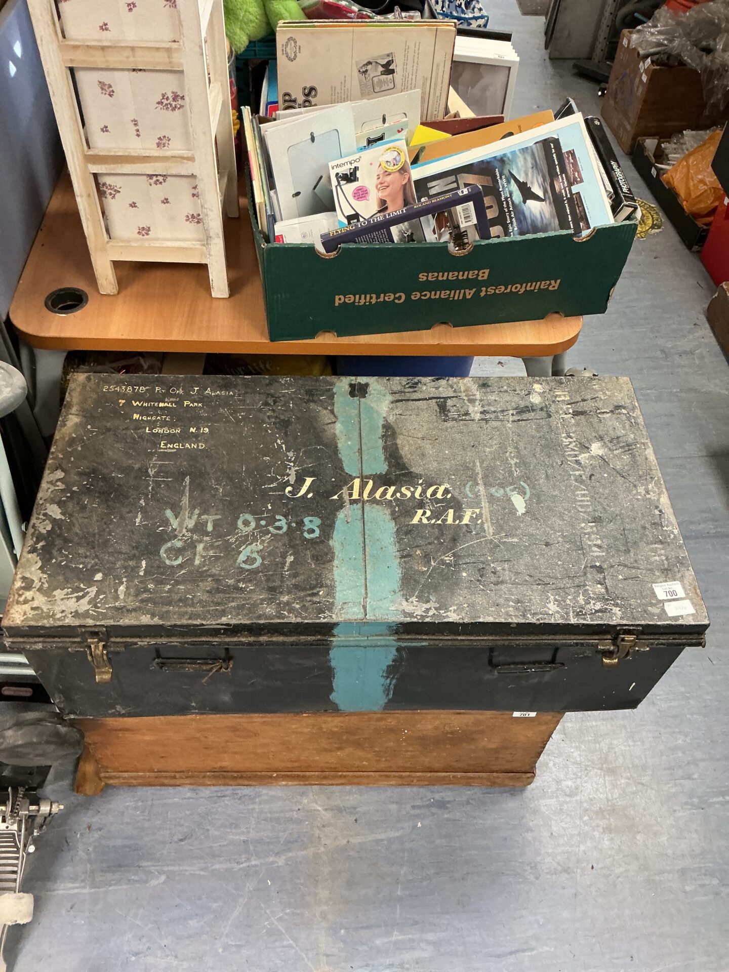 This is a vintage trunk, bearing markings indicative of its use by a Royal Air Force Pilot Officer. The trunk appears to be constructed from wood with a canvas covering, and features painted details and lettering associated with RAF service. It is a fascinating piece of aviation history, likely used for transporting personal belongings during service.
