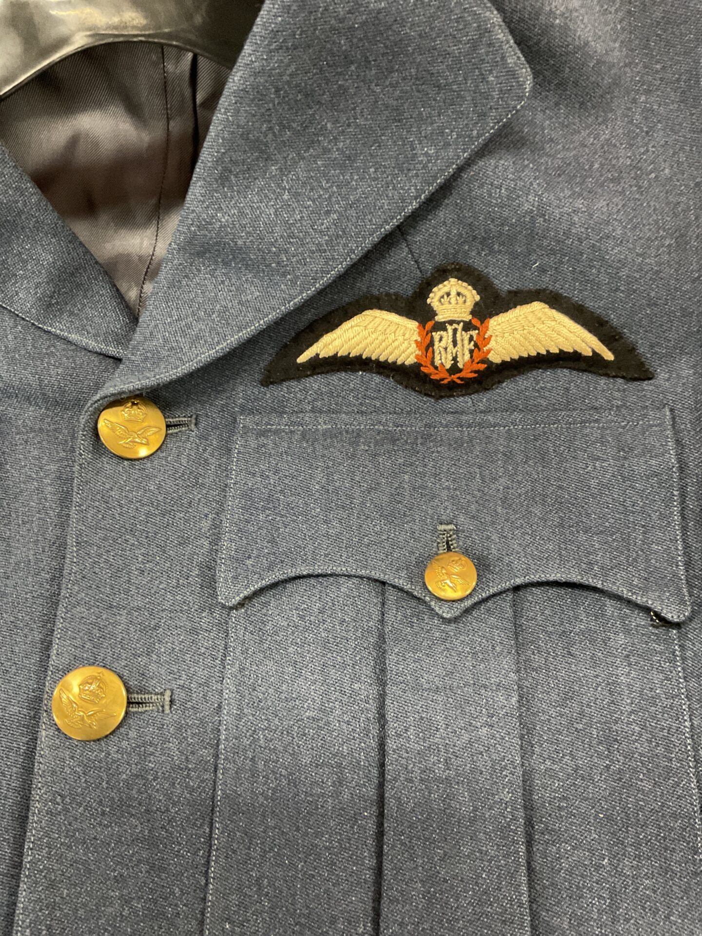 This is a vintage Royal Air Force (RAF) Pilot Officer’s tunic, bearing the name ‘J Alasia’ and number ‘2542878’ to the interior lining. The tunic is constructed from a grey-blue wool serge, featuring a traditional single-breasted design with brass buttons. The tunic displays pilot’s wings insignia to the breast, and features adjustable cuffs and a belted waist.