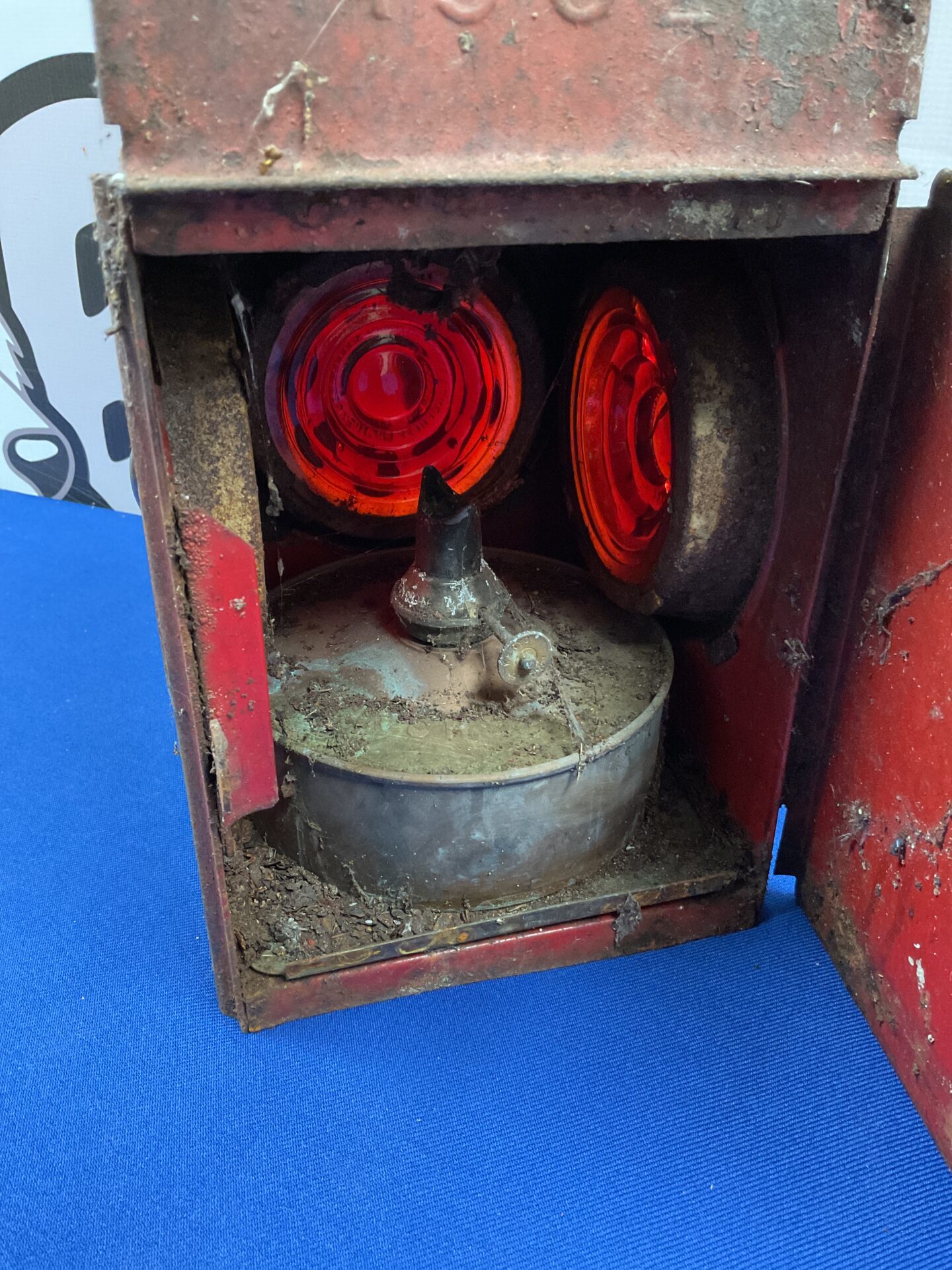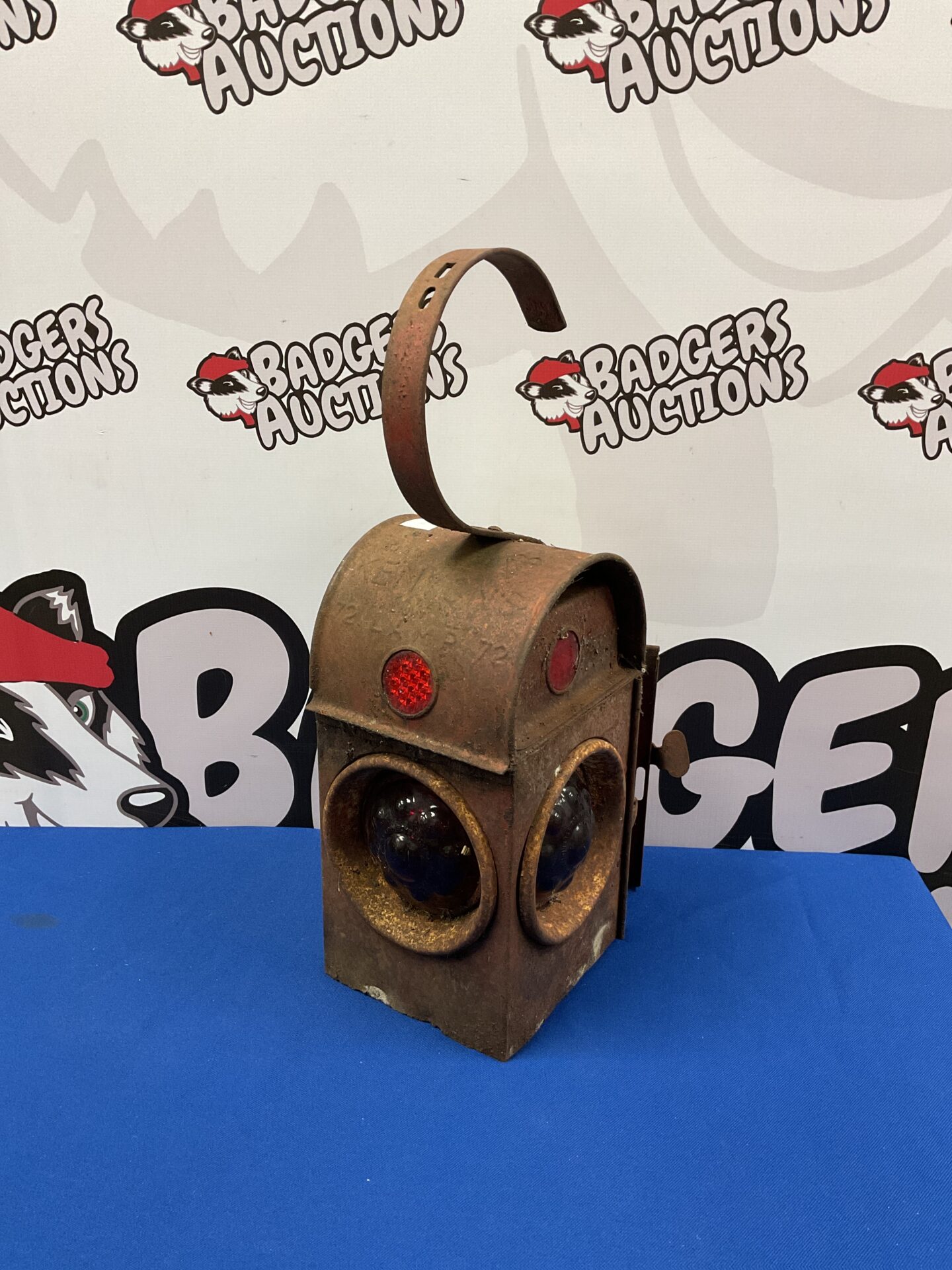 The lantern exhibits signs of age and use, consistent with its history as working railway equipment. The metal body shows patina and some surface corrosion, while the glass is present but may exhibit minor imperfections. This lantern would be of interest to collectors of railway memorabilia, vintage lighting, or industrial artefacts. Its authentic character and historical significance make it a desirable piece for display or inclusion in a collection.