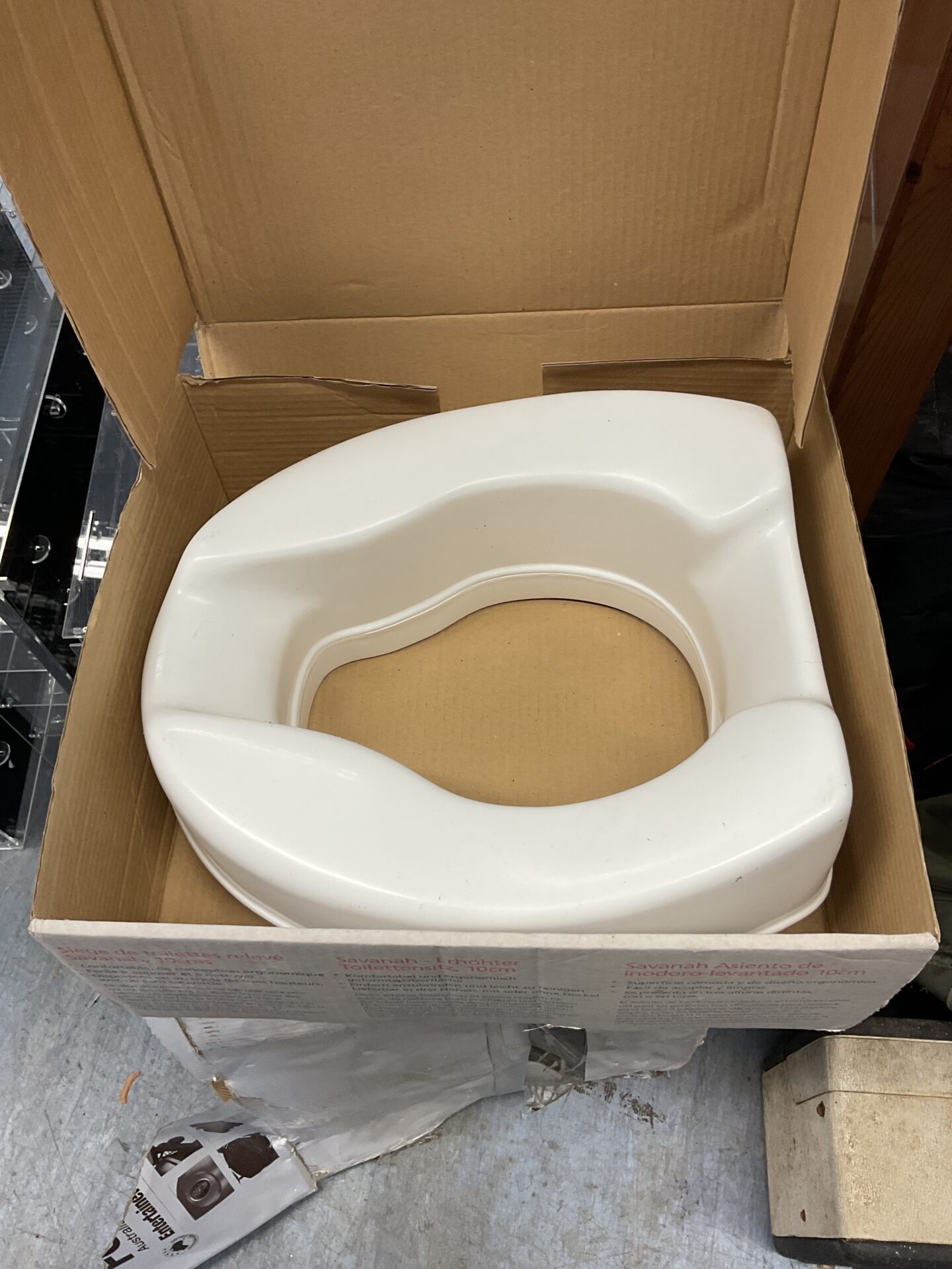 This raised toilet seat is new and unused, still in its original packaging. It represents a practical item for those needing assistance in the bathroom, but could also appeal to collectors of vintage or medical aids. Its pristine condition makes it a desirable find for anyone seeking a functional and reliable mobility aid.