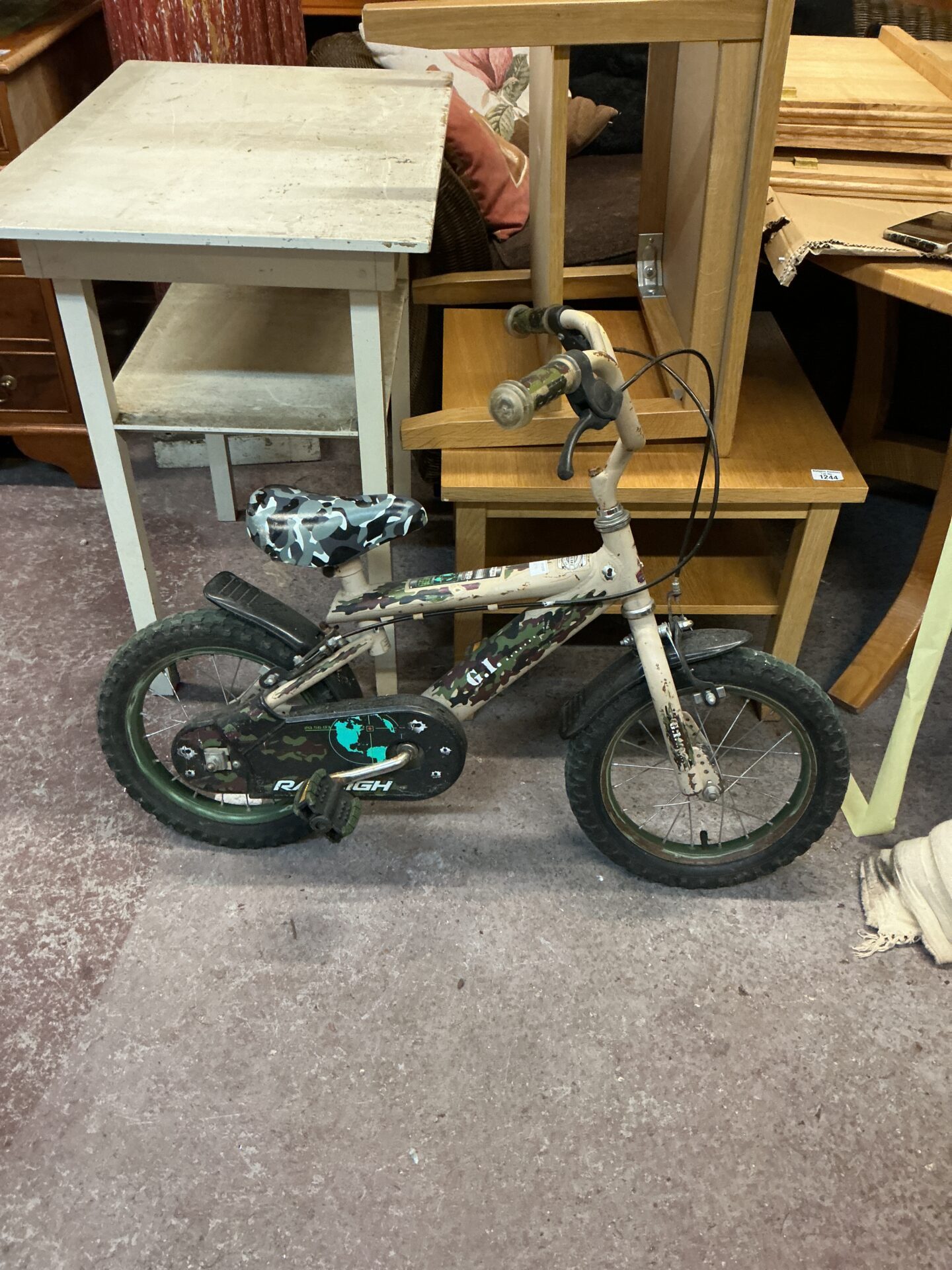 This is a Raleigh G.I. bike, designed as a rugged and adventurous bicycle for children. The bike features a distinctive camouflage paint scheme and appears to be styled for off-road or mountain biking. It’s a robust build, suggesting it was intended for outdoor use and potentially rough terrain.