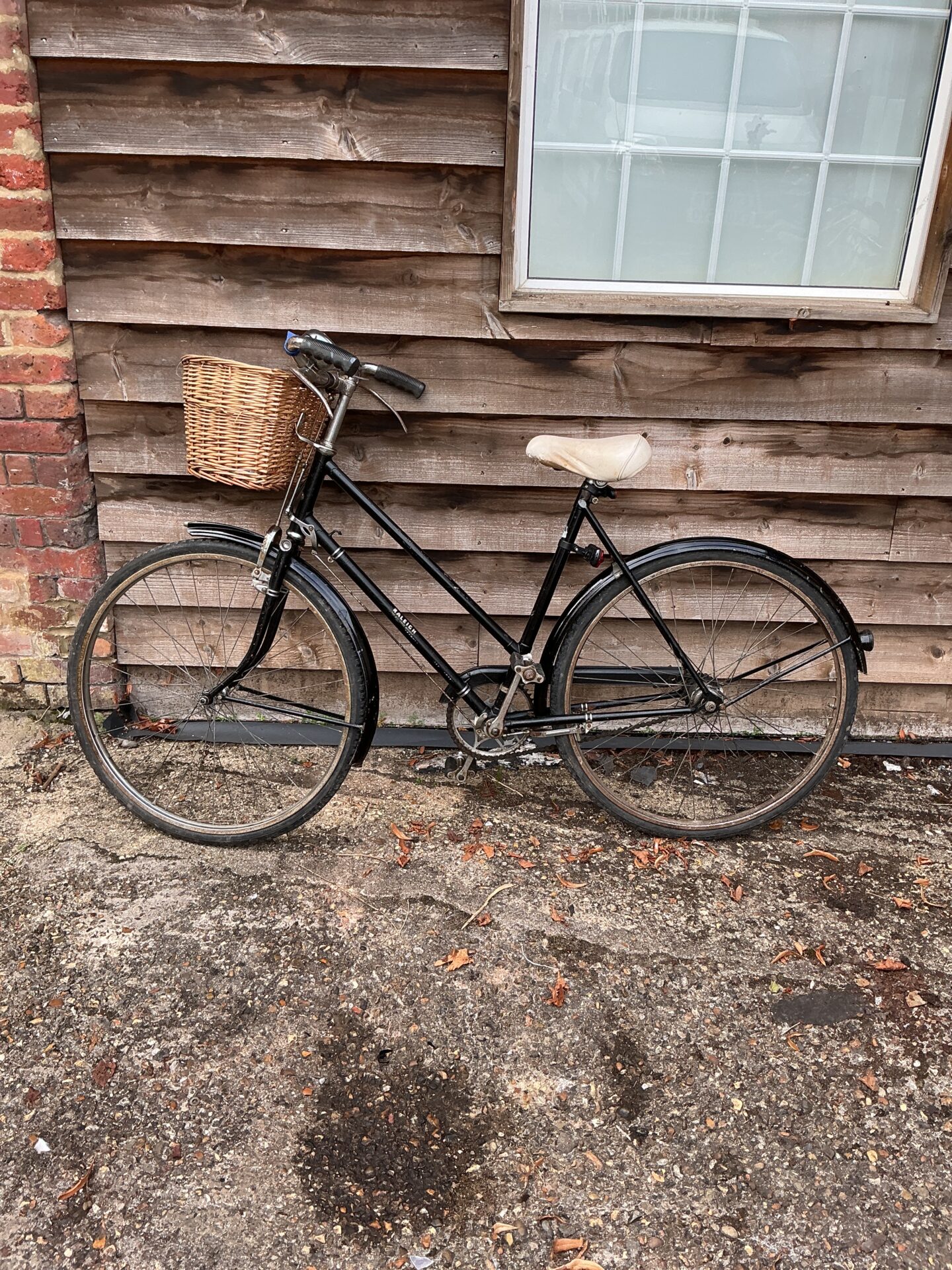 This is a charming classic Raleigh ladies bicycle, a beautiful example of vintage British cycling. Featuring a traditional step-through frame, this bicycle is designed for comfortable and stylish riding. The bicycle includes a front wicker basket, adding to its classic appeal and practicality. It’s a wonderful piece for both cycling enthusiasts and collectors of vintage memorabilia.