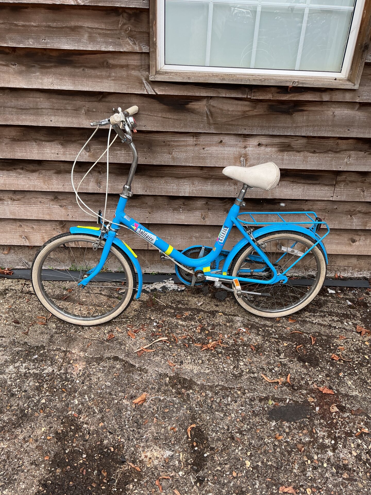 This is a classic Raleigh Solitaire folding bicycle, a popular model known for its portability and practicality. Featuring a distinctive blue frame and a step-through design, this bike is ideal for commuters or those with limited storage space. The Solitaire boasts a single-speed drivetrain, making it simple and easy to maintain, and its folding mechanism allows for convenient transport and storage.