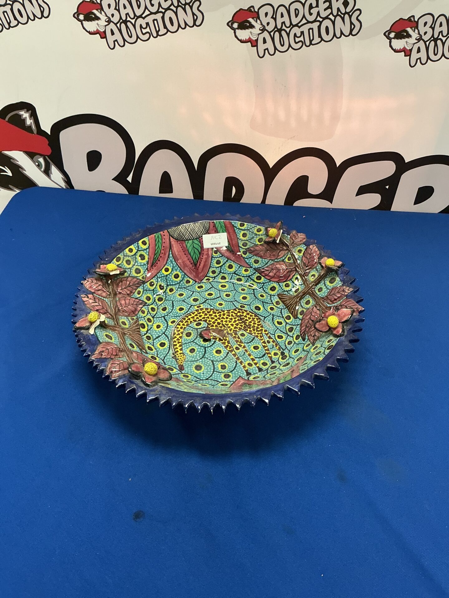 This is a striking studio pottery bowl created by Raphael. The bowl features a vibrant, hand-painted design with floral and foliate motifs, executed in a bold and colourful palette. The style is reminiscent of mid-century modern art pottery, with a focus on organic shapes and expressive brushwork. This bowl is a testament to Raphael’s skill and artistic vision.