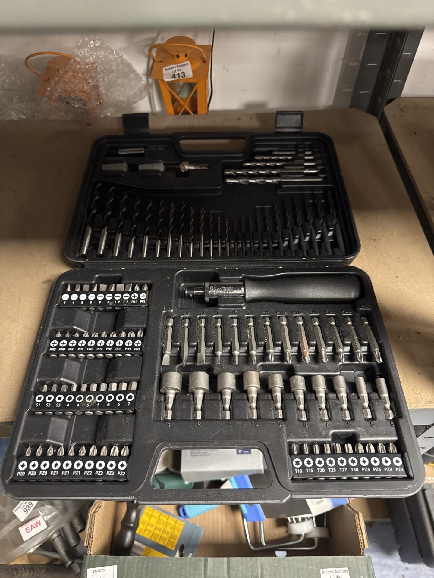 The set shows signs of age and use, with some surface wear and possible corrosion on the metal components. The bits appear to be present, though a detailed inventory has not been conducted. This set may appeal to collectors of vintage tools or those seeking a functional, classic tool for their workshop.