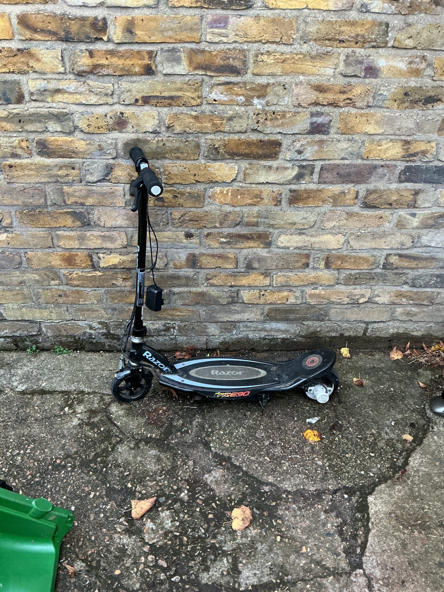 This Razor E Prime electric scooter is presented for consideration by a collector or enthusiast. Its condition should be assessed by the prospective buyer, and it is sold as seen. It may appeal to those interested in vintage or retro scooters, or those seeking a project to restore or modify.