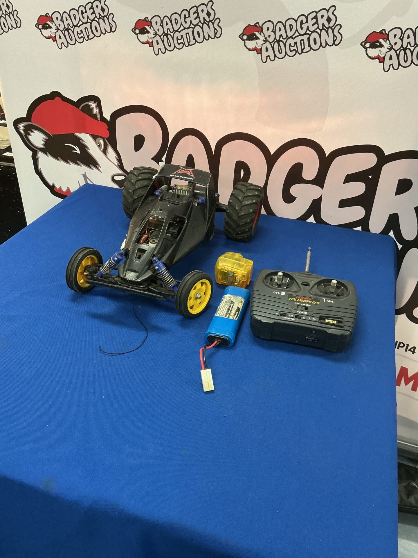 The RC car appears to be in used condition, with signs of wear consistent with its age and use. It may appeal to collectors of RC cars, hobbyists interested in restoring or modifying vehicles, or individuals seeking a vintage toy. The included handset and charger add to its completeness as a display or project piece.